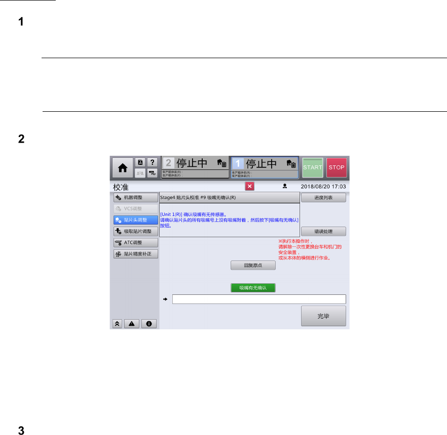 第 2 章 操作顺序书 2- 3. 校准 86 吸嘴有 确认 将基准吸嘴安装到全部 吸嘴号上。 注意 • 安装吸嘴时,请解除一 次性更换台车和前面 护罩的锁定,在护罩 打开的状态下作业 , 或者从机器侧面进行作 业。 触摸[吸嘴有无确认]。 进行左右一次性更换台 车上升、前面护罩的 锁定后,旋转转塔以 检查吸嘴号 #1 ~ #16 有无吸嘴。 如果全部吸嘴号上带有 吸嘴,画面下方的结 果显示栏内将显示[ 正常 ( 有吸嘴 ) ]。如果不…