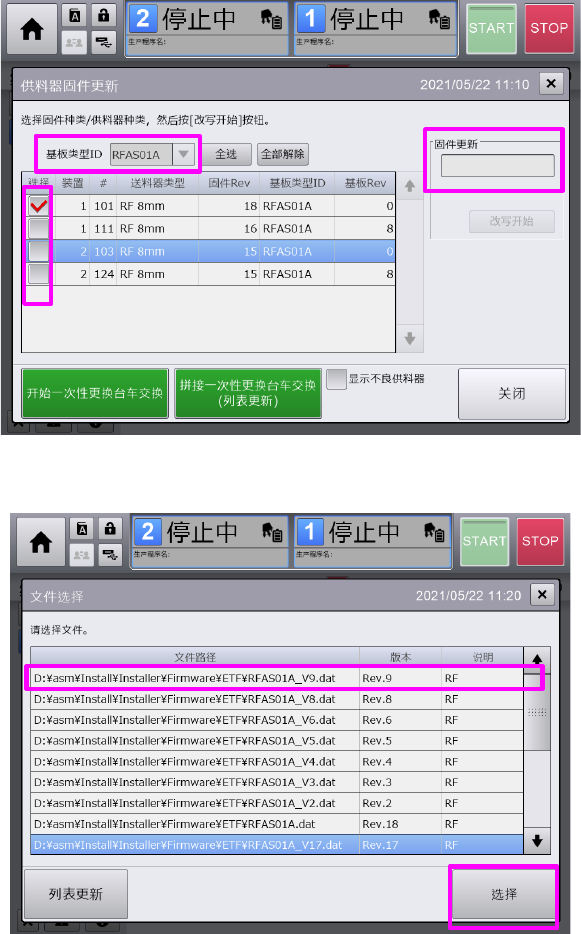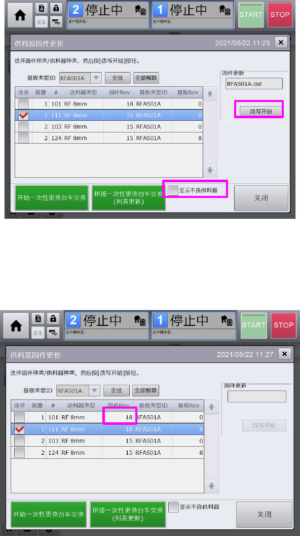 切换至供料器固件更新画面后,按下[改写开始],开始更新固件