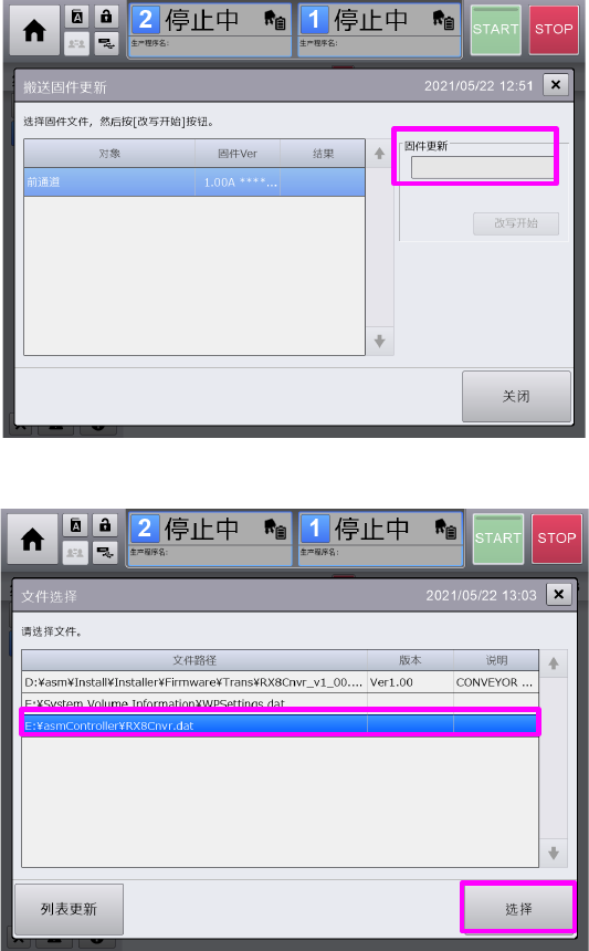 切换为搬送固件更新画面后,按[改写开始]开始更新固件。