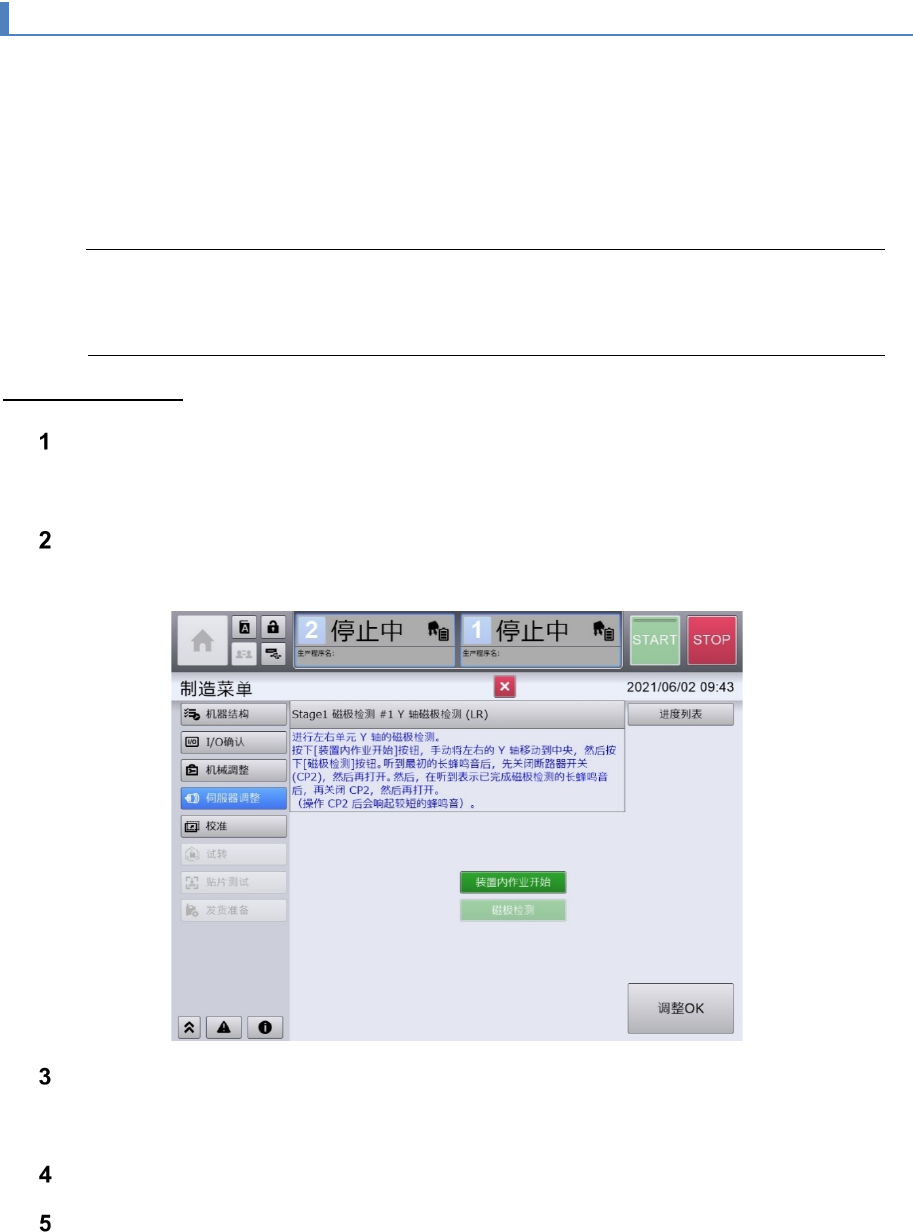 第 2 章 操作顺序书 2- 2. 制造设置菜单 36 2-2- 4. 伺服调整 确认轴的伺服参数是否 恰当,同时根据需要 更改 参数 以消除轴动作的装置间个 体差。 伺服调整通过以下 3 步 Sta ge 进行 作业。 • Stage1 :磁极检测 • Stage2 :暂定 原点确定 • Stage3 :伺服器调整 注意 • 如不进行磁极检测就将 伺服的电源 置于 ON ,轴可能以规定值 以上 的速度移动 ,在装 置内引起碰撞。 St…