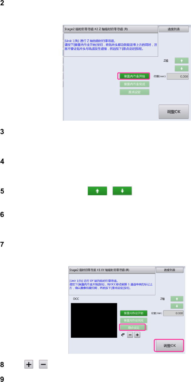 第 2 章 操作顺序书 2- 2. 制造设置菜单 39 进行右侧一次性更换台 车下降、前面护罩解 除锁定。 打开前面护罩,以手动方式移动右侧装置之贴片头机构的 XY 轴,一直移动到 O CC 的 显示图像内出现第 1 通道中央标记的地方。 如贴片头与轨道干涉, 请按以下操作顺序 进行 Z 轴的上升操作。 1 按下[装置内作业完成 ] 按钮 。 进行右侧一次性更换台 车 上升 、前面护罩的锁定。 2 触摸 使 Z 轴上升 。 在 JOG …