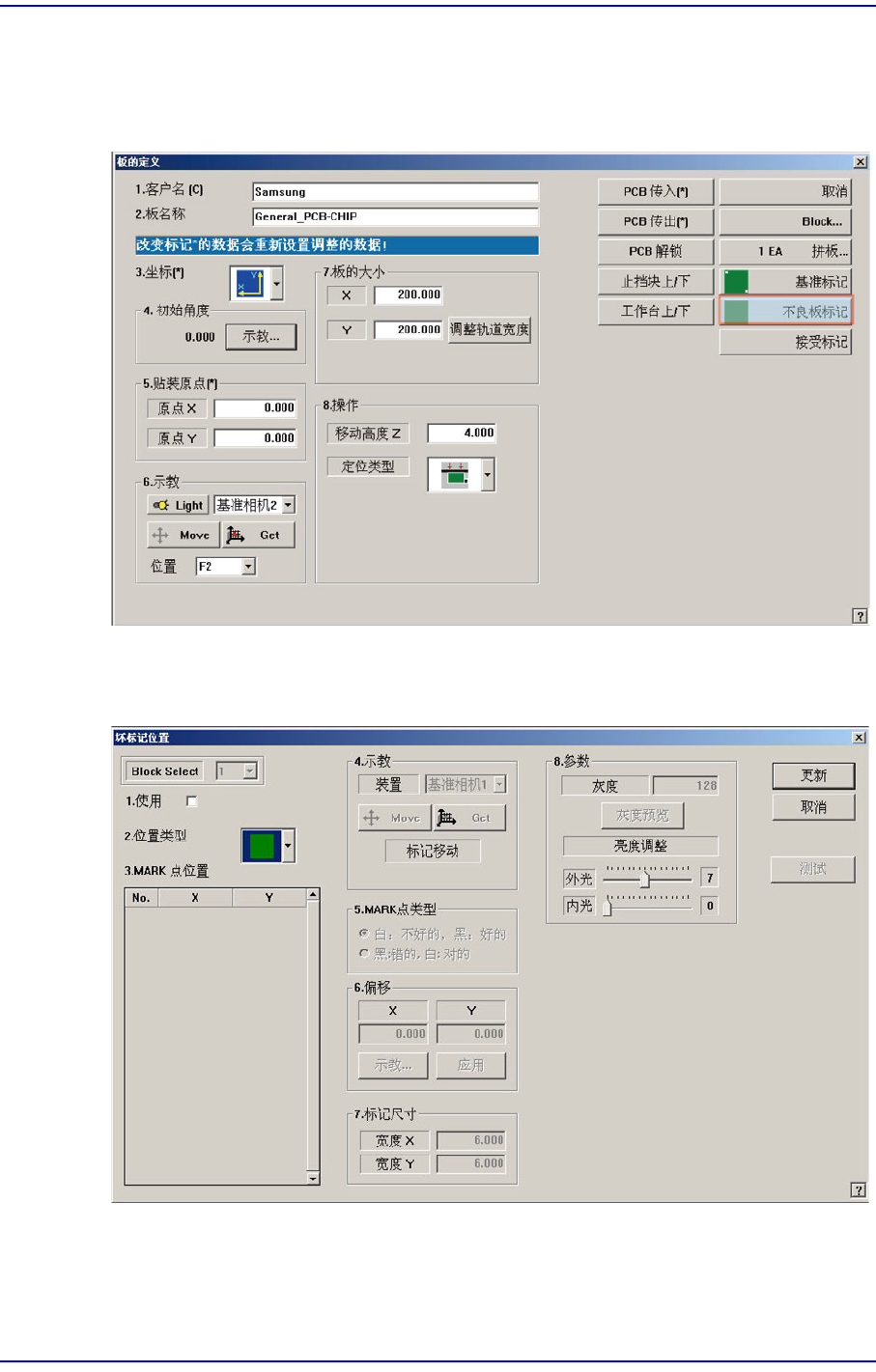 6-28 Next Generation, Multi-Functional Plac er DECAN S1 Administrator’s Guide Block PCB 时 选择要设置的模型后, 请设置其他的项目。 <1. 使用 > 选择框 选择坏标记的检查与否, 或检查时使用。 <2. 位置类型 > 组合框 选择坏板标记的位置。 可选择的坏标记的 位置如下。 None: 没有坏板标记。 拼板 …