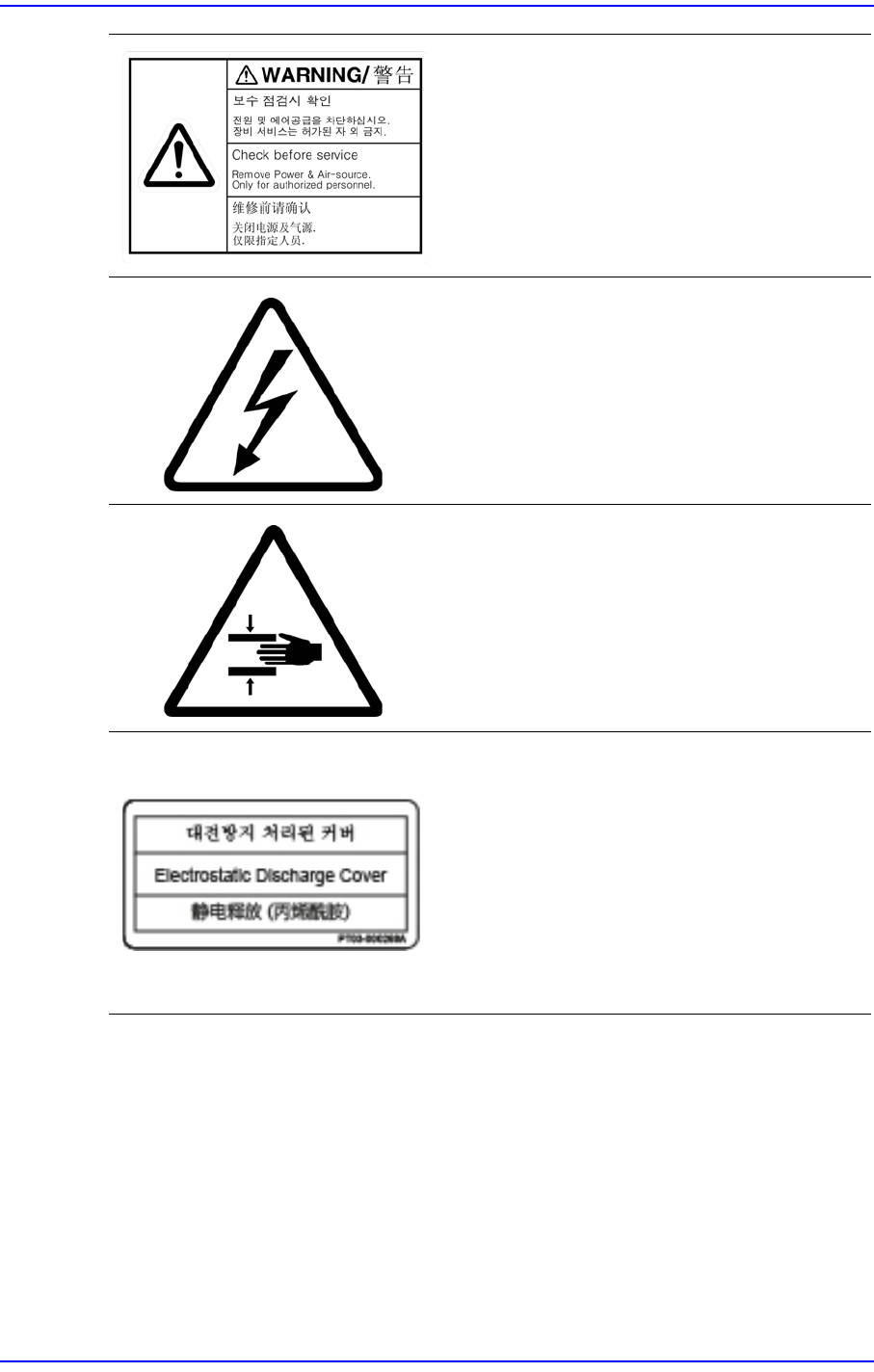前言 vii 维修前确认 维修前请除去空气管。 盖内侧及周围连接物部位存在高电 压要注意 电击危险。 在维护和修理设备操作时一定要先 切断主电 源。 设备运行时请勿伸进手 贴有此标签处有移动体, 驱动中拆开或 打开 盖把身体的一部分伸进设备内部时 非常危 险。 维修前请停止设备。 为了维修设备及采取故障措施请首 先停止设 备。 请小心清理 Cover 。 使用干净的超细纱布沾取指定的清 洗液轻柔 擦拭 Door 的亚克力 Cover 。…