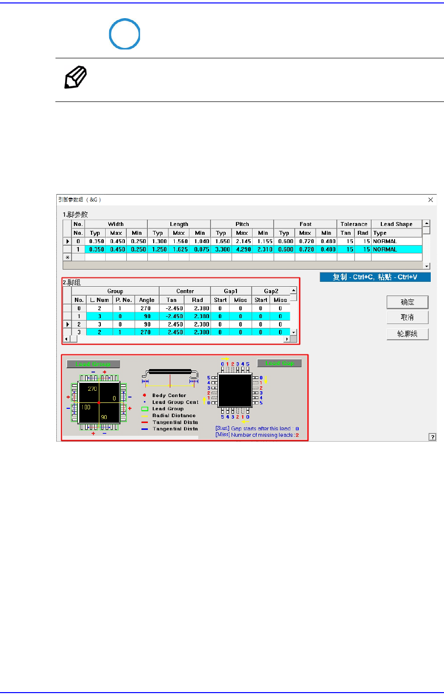 设定本引线到邻接的引线中心的距离-间距。该参数是识别元件时的敏感参