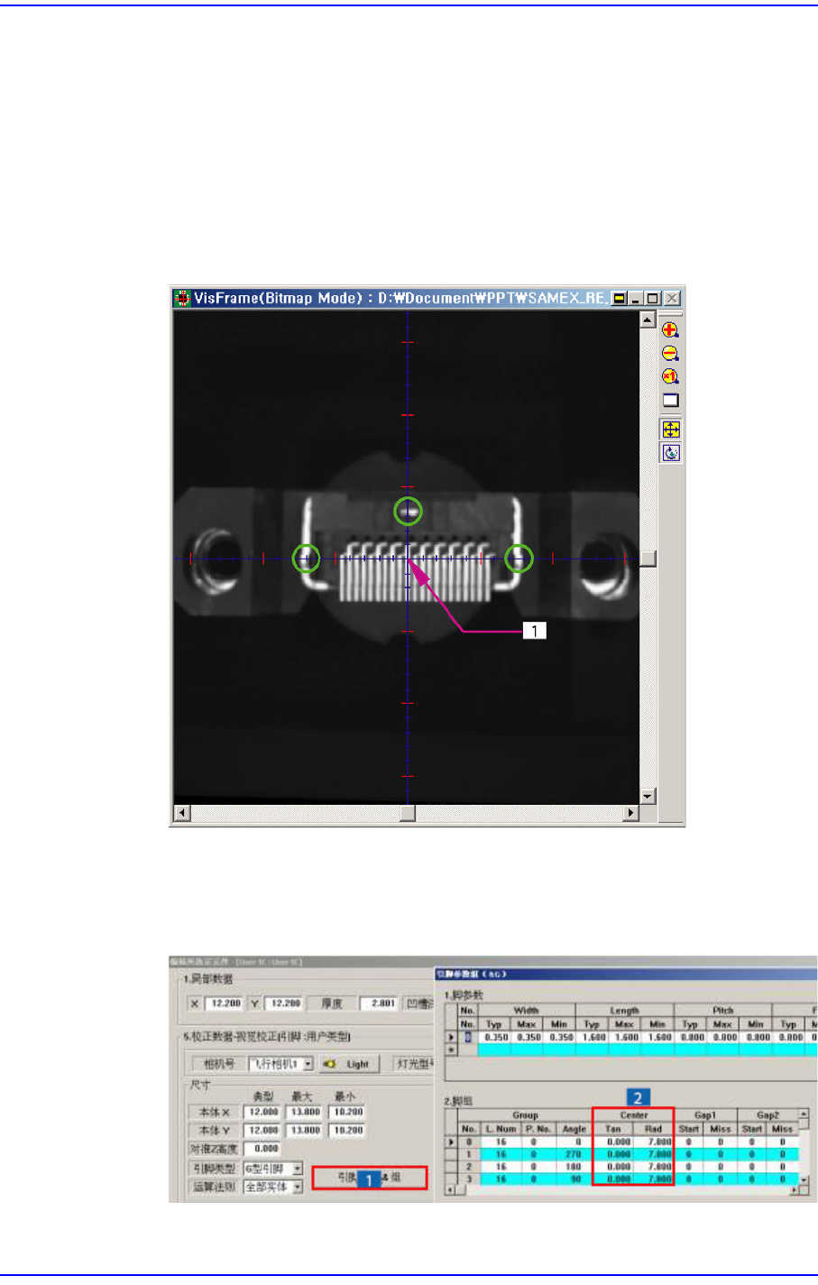 7-74 Next Generation, Multi-Functional Plac er DECAN S1 Administrator’s Guide 1: Lead( 引脚 ) 末端 2: 亮区 贴装点示教 在 St e p 对话框中选择相 应部件的 Reference 点击 <Move> 按钮把 Fiducial Camera 移动到相应位 置。 PCB 上适用于该元件 的插孔不会全部显示在 SMV is…