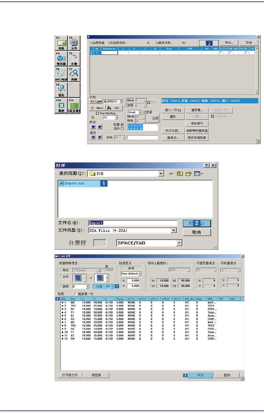 9-13 Step Programming 利用 Import 的 SSA 文 件选择需要作业的设备。 选择需要输入的设备 (Imported Machine) 。然 后 检 查 Placements 的列 (Row) 名 是否正确。 如果是本公司的标准格式 (SSA Format) , 则 不必更改该列的值。 执行 Import 。 如果输入了本公司标准格式之 外的文件格式, 该列将如下显示 Comment 。把 鼠标指针移到…
