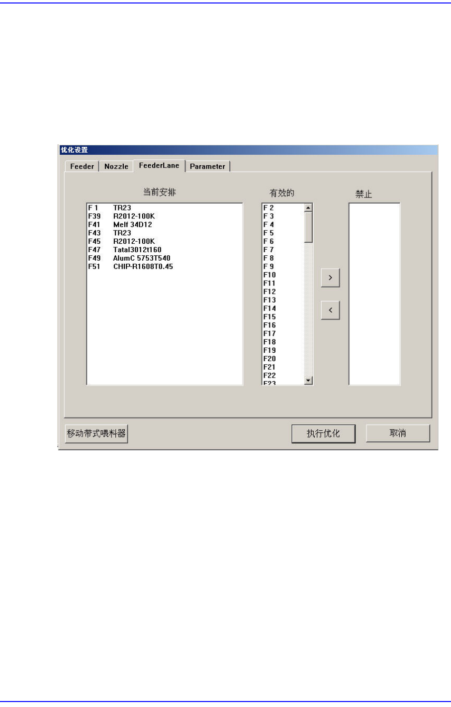 10-5 Optimization 存储上述选择的选项并关闭对 话框。 < 取消 > 按钮 取消上述选择的选项并关闭对 话框。 10.3. Feeder Lane 图 10.4 " 优化设置 : FeederLane" 对话框 此对话框设定用于优化喂料器配 置的 喂料器通道。 配置在 喂料器通道的装置包括 带式喂料器 , 可布置 Feeder Lane 的设备有 Ta p e F e e d e r …
