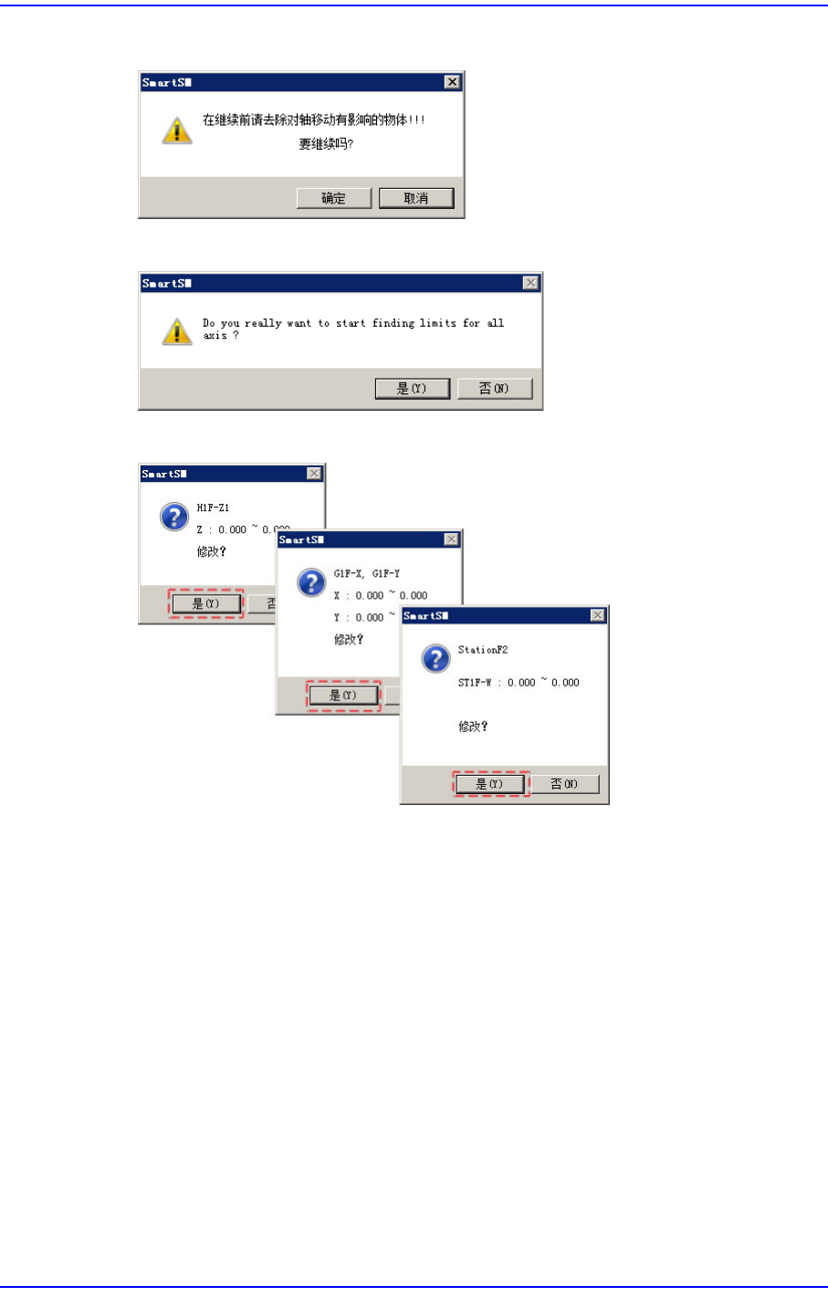 14-19 Machine Calibration 5. 确认设备内部或 Conveyor 上是 否有物体后, 点击 < 确认 > 按钮。 6. 点击 < 是 > 按钮。 7. 按轴测量 Limit 值 。点 击 < 是 > 按钮。