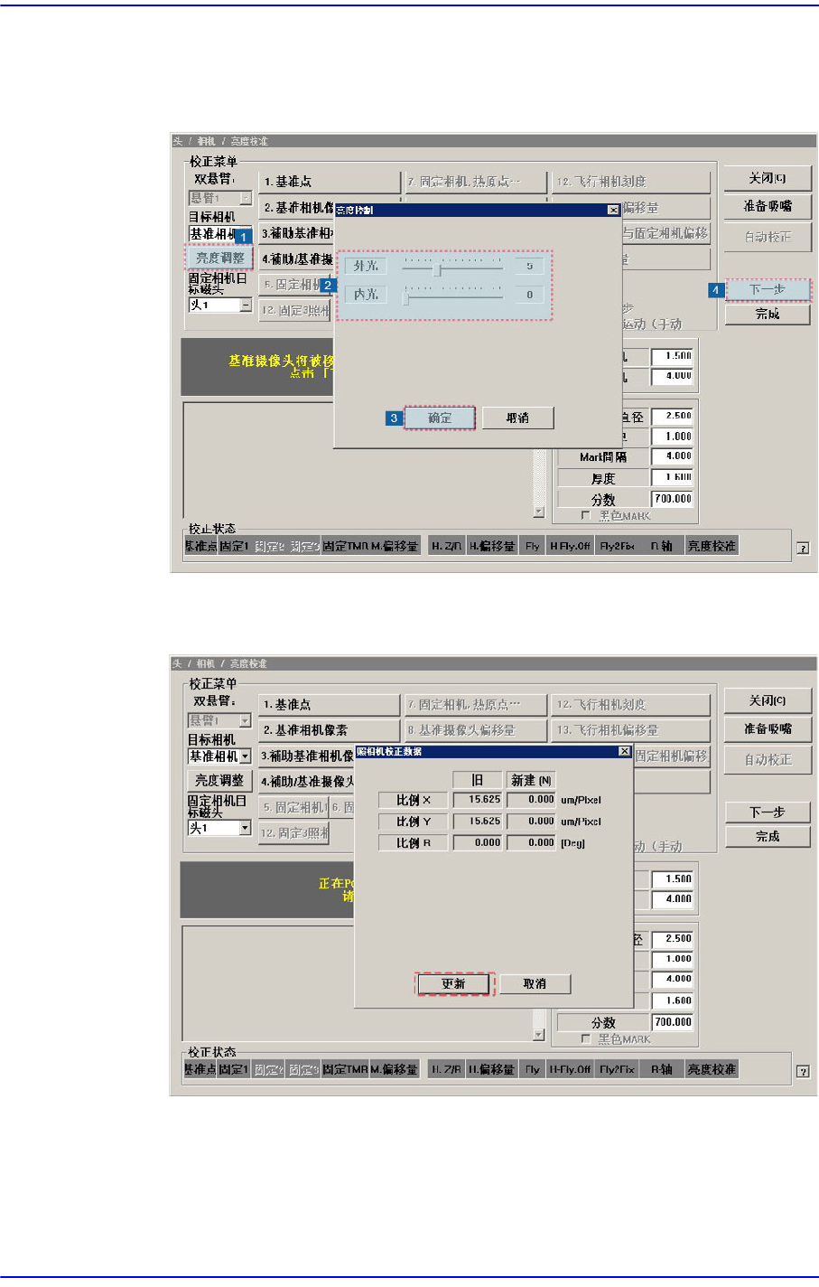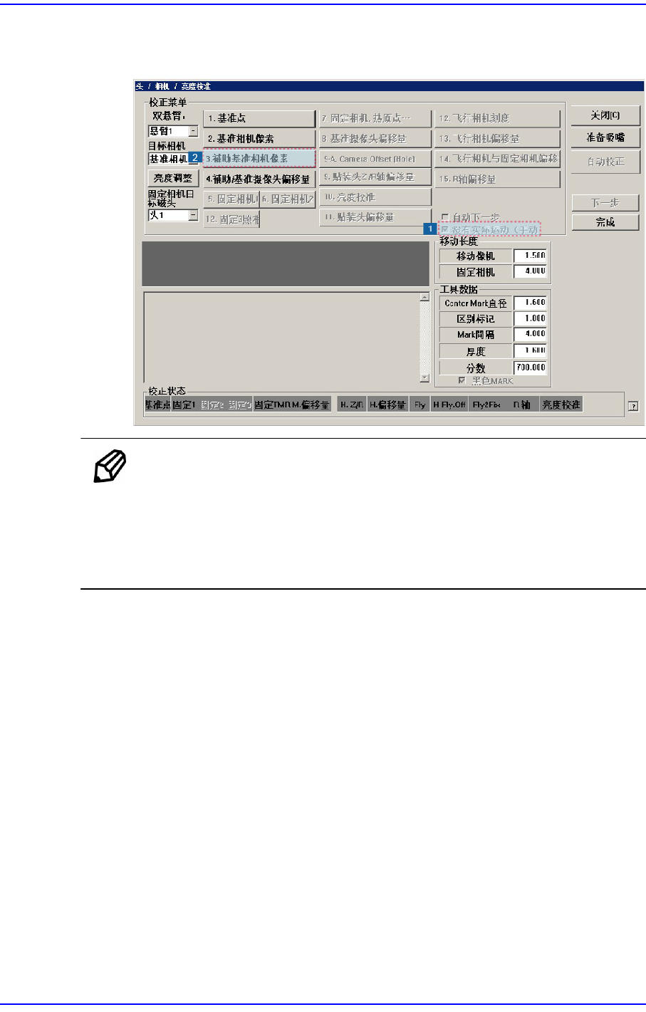 14-27 Machine Calibration 5. 每个悬臂使用 2 个基准相机时, 点击 <3. Other Fid. Camera Scale> 键后按 照同 一方法实行校准 (Calibration) 。 备 注 (Ref. / Other) 基准相机 (FO V7.5) 的校正基准 值如下 ScaleX: 13.0 ~ 17.0 ( μ m/pixel) ScaleY : 13.0 ~ 17.0 ( μ…