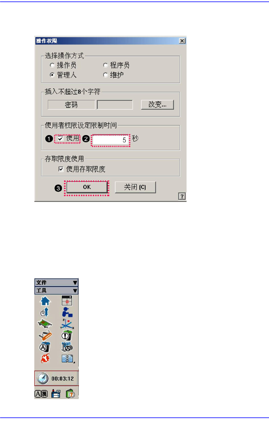 1-10 Next Generation, Multi-Functional Plac er DECAN S1 Administrator’s Guide 1.3. 用户登录时间设定 经过设定的时间后用户权限自动转 换成 Operator 。 设置方法如下。 在 <Authority Limit by time> 领域选择 <Use> 选择框 在编辑框中以分为单位 输入要设置的时间 点击 <OK…