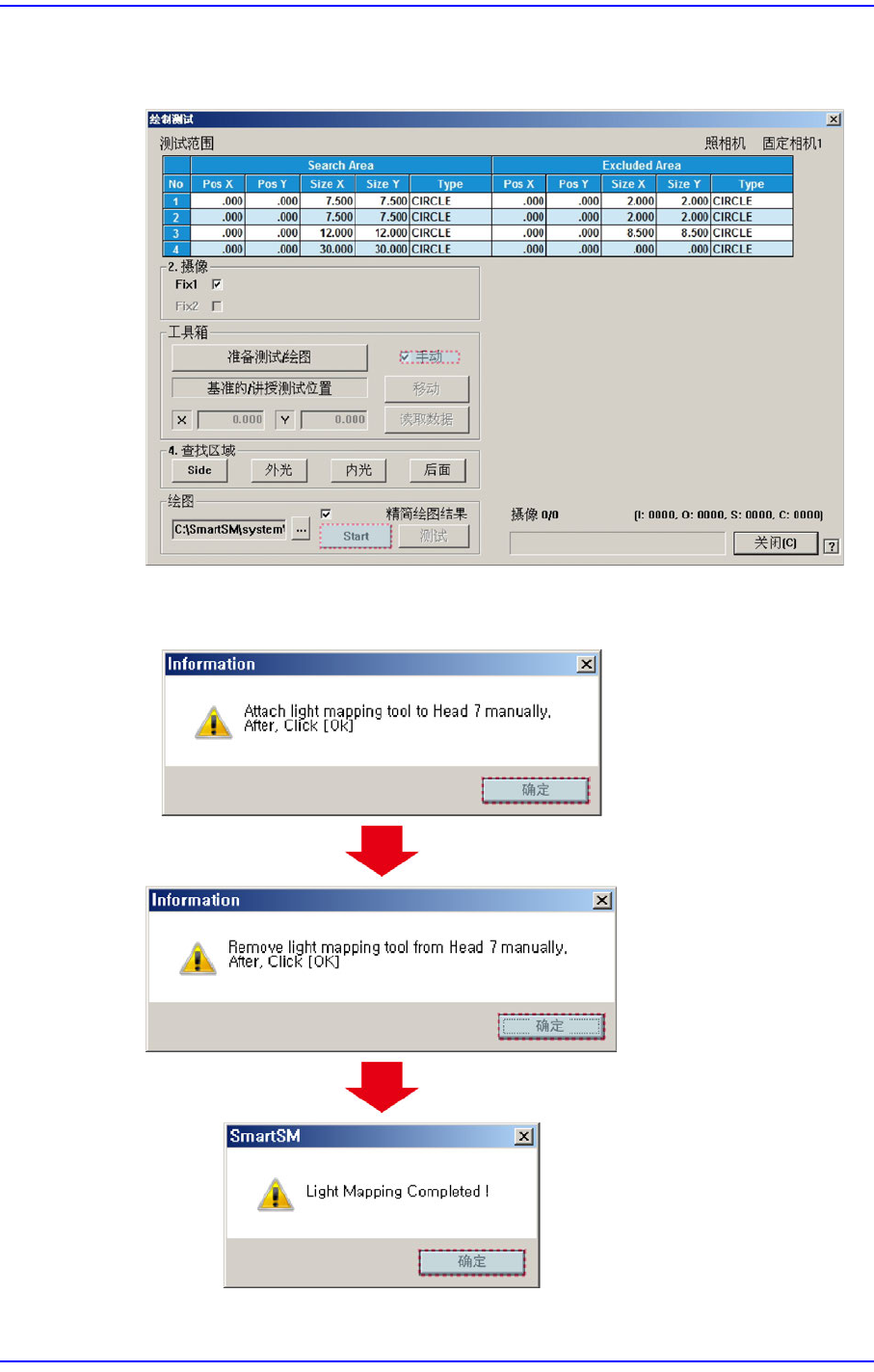 15-37 系统设置 5. 选择 <3. T ool Setting> 领域的 <Manual> 复选框。 单击 <<Mapping>> 领域的 <Start> 按钮后把 Light Ma pping T ool 插入 7 号 Head 。 6. Light Mapping 完毕后会出现下列 对话框。 单击 < 确定 > 按钮就会出现 T est 用对话 框。