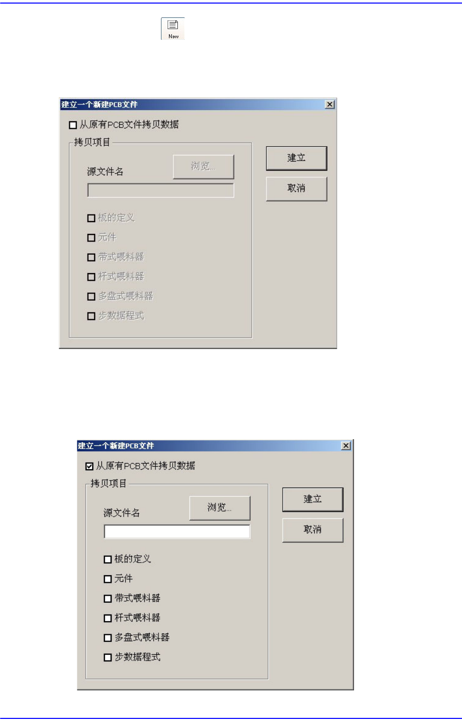 3-2 Next Generation, Multi-Functional Plac er DECAN S1 Administrator’s Guide 3.1. 新建 ( New ) [Ctrl+N] < 新建 > 命令在新建 PCB 文件时使用。 选择 < 新建 > 命令时显示如下的对话框。 图 3.2 “ 产生一个新的 PCB 文件 (新建 PCB 文件) ” 对话框 < 从原有 PCB 文件拷贝…
