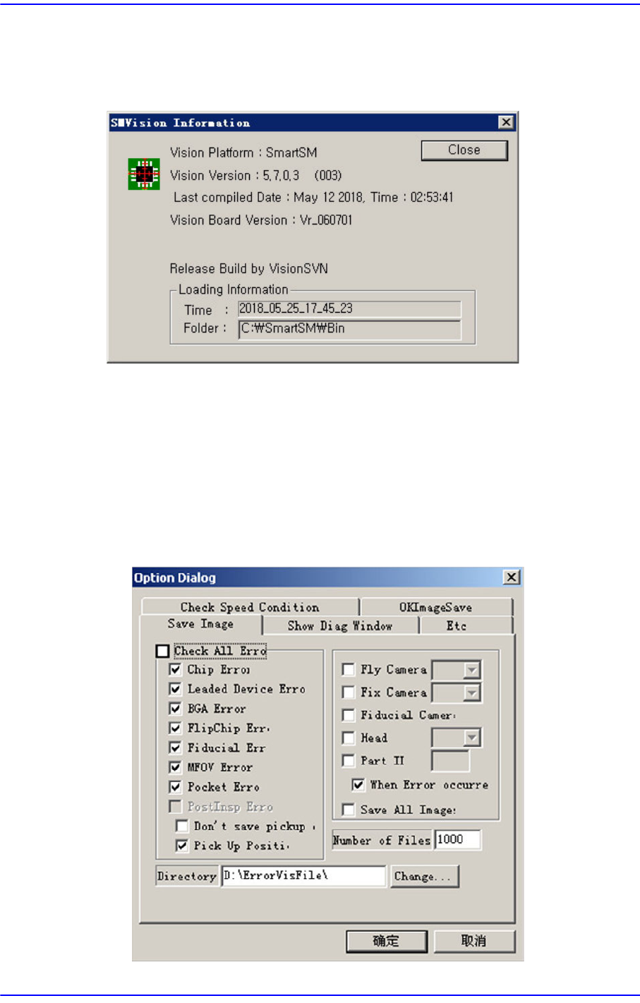 4-5 Tools 简化操作 (shortcut) 菜单 < Check All Errors> 选择框领域 可指定部件类型保存相应部件的 错误, 也可指定摄象机利用相应摄象机 仅限识别的部件保存错误。 <Save All Image> 领域 文件的最大保存个数可以在 ‘Number of files’ 设定。 最大保存可能个数为 5000 个。 <Directory> 领域 保存文件的位…
