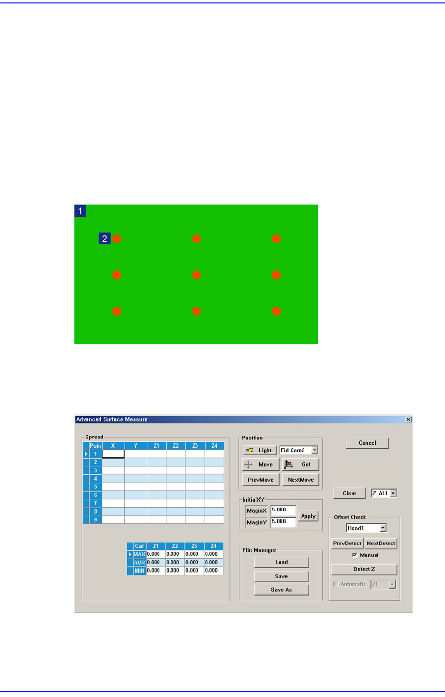 4-23 Tools 简化操作 (shortcut) 菜单 <Point> 列 该位置用来测量基板的平坦度。 <X> 列 平坦度测量位置的 X 位置值。 <Y> 列 平坦度测量位置的 Y 位置值。 <Z1~4> 列 在 X 、 Y 位置值测量的 Z 高度值 。 <MAX> 行 表示基板 9 点的 Z 测量值中的最大值。 <MAX> 行 表示基…