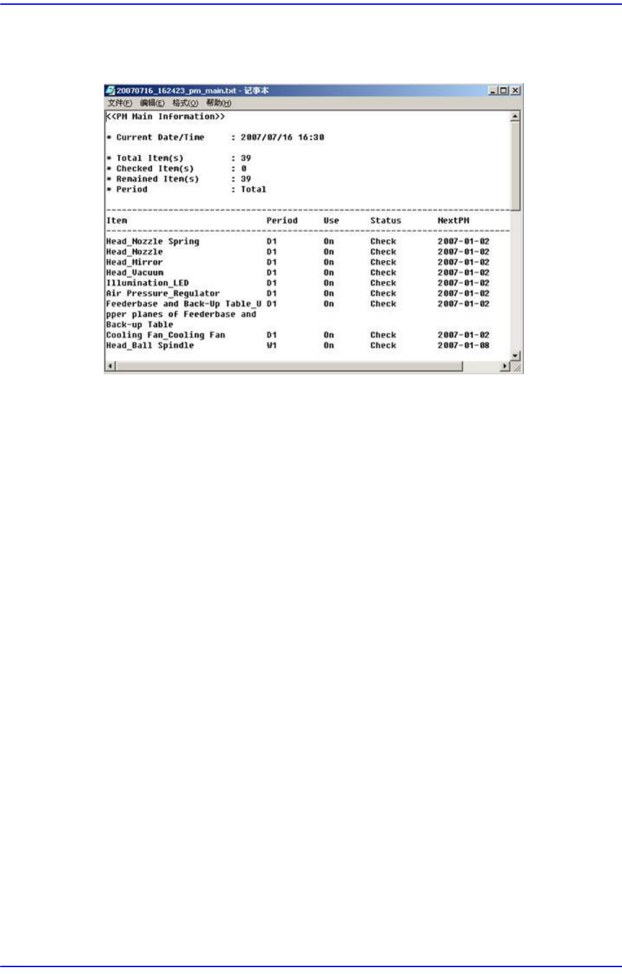 19-17 PM Manager 19.6.1. 搜索条件 选择以下项目的校验框, 输入搜索条件后可 搜索检查记录。 All 显示所有的检查历史。 Group 选择检查项目组。 Item 选择检查项目。 Operator 选择使用者。 Action 选择是否对检查项目采取措施。 Result 显示检查项目状态。 Date 选择要查看的日期。 19.6.2. 以文件形式输出检查记录 搜索的检查记录或者所有检查记…