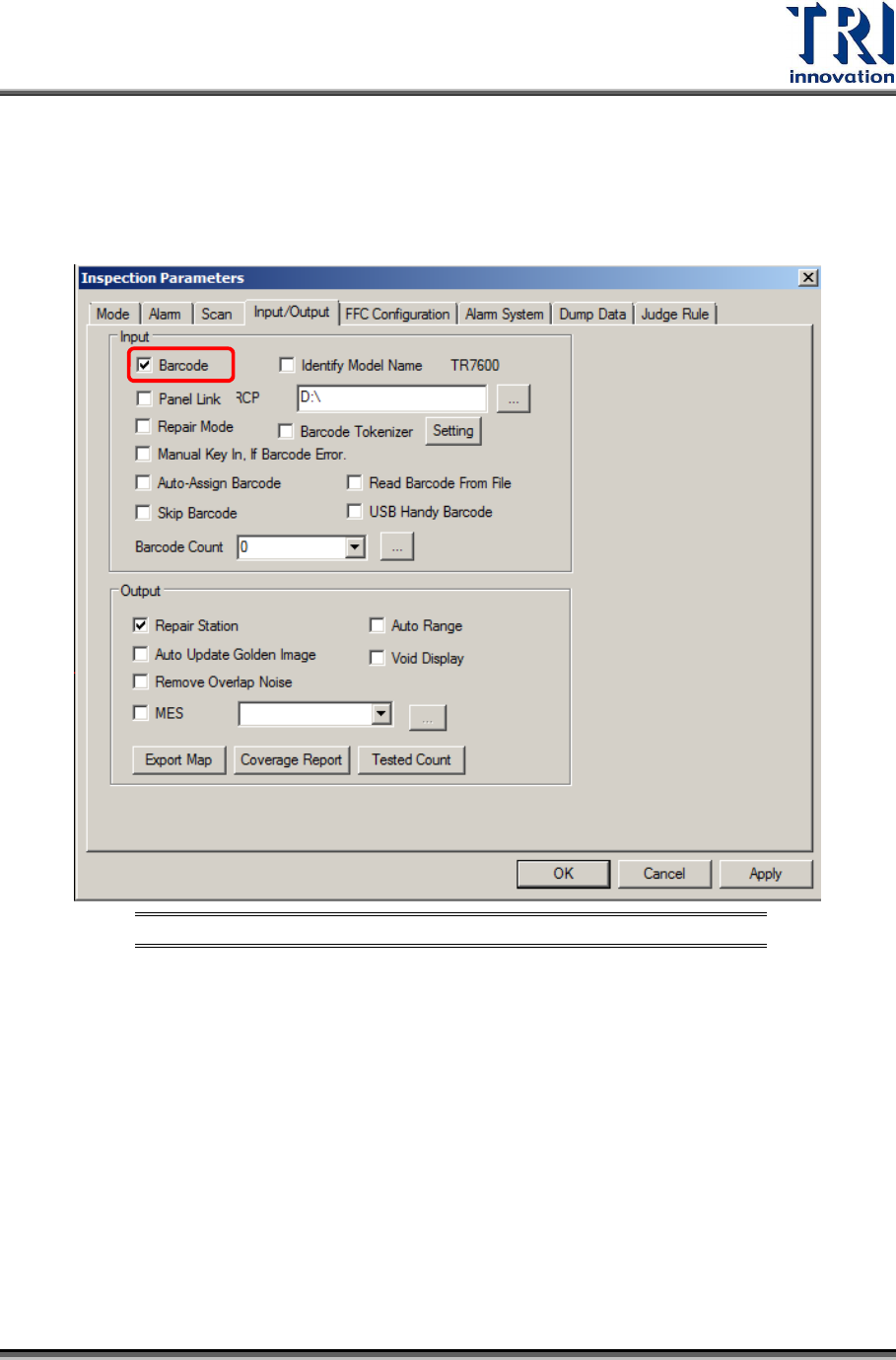 Test Research, Inc . TR7600 SIII Series User Gu ide – Operat ion 11 2.7 Other Se ttings 2.7.1 Enable Barcode Reader 1) Checking [Inspect/Parameters/Input/ Output/Enable B arcode] enables the f ixed barcode to scan barcod…