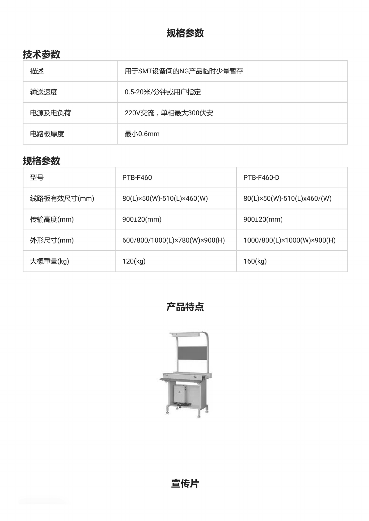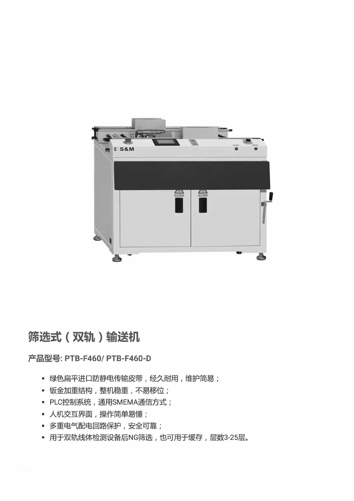 筛选式 ( 双轨 ) 输送机 产品 型号: PTB-F460/ PTB-F460-D • 绿 色扁平 进口防 静电传 输皮带 ,经 久耐用 ,维 护简易 ; • 银金加 重结构 , 整 机稳重 , 不 易移位 ; • PLC 控 制系统 , 通用 SMEMA 通 信方式 ; • 人机交 互界面 ,操 作简 单易懂 ; • 多重 电气配 电回路 保护, 安 全可靠 ; • 用于 双轨线 体检测 设备后 NG 筛选 , 也可用 于缓存 , …