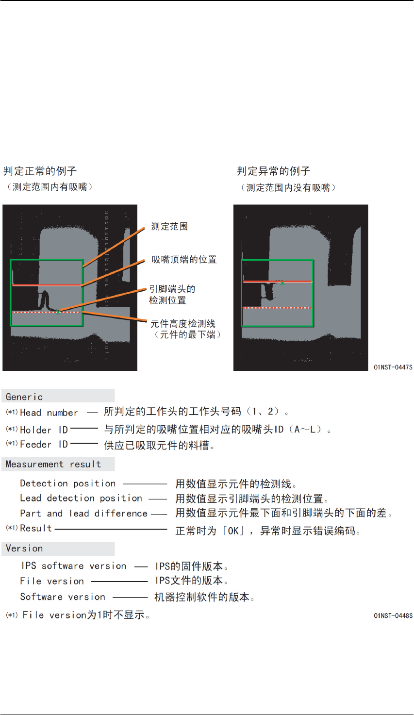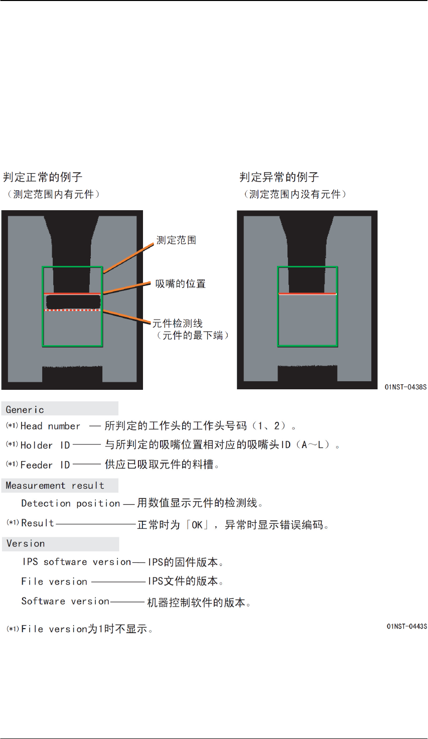 Edition 1.0 N X T I I 用户高级培训手册 FMC-1010-003-0 C 8-33 FUJI MACHINE MFG. CO., LTD 《显示元件高度判定的结果》 属性栏的「 Process type 」如下时,显示的是元件高度判定的结果。 Image acquisition time ·After pickup Check details ·Measure part height 关于所显示的影像 判定时的图像…