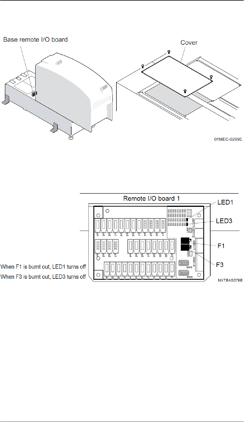 以下显示出基座控制箱的位置。基座控制箱的 I/O 电路板上的保险丝烧断时,检查保险丝用的