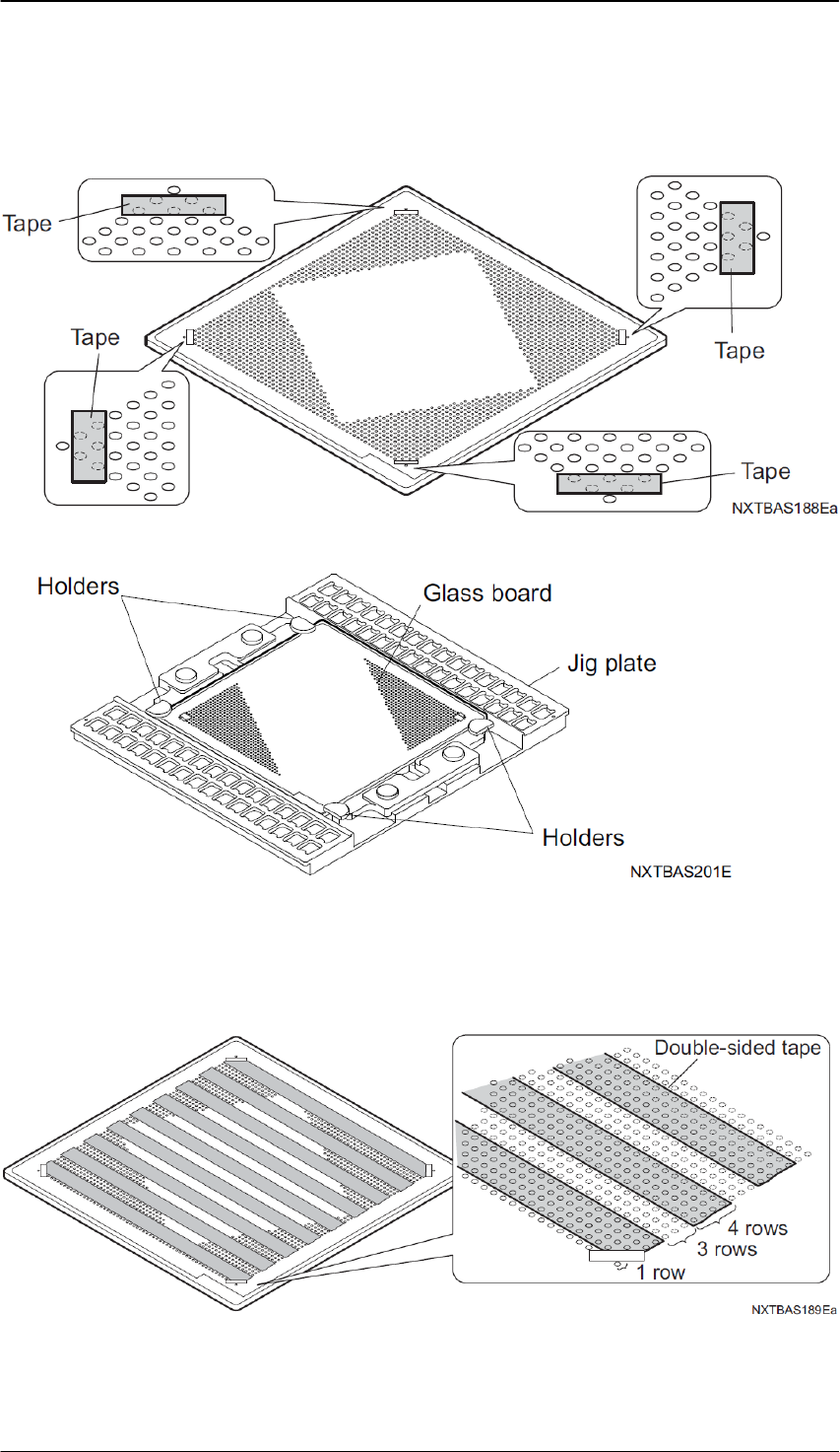 Edition 1.0 N X T I I 用户高级培训手册 FMC-1010-003-0 C 5-24 FUJI MACHINE MFG. CO., LTD 4. 请将玻璃元件安装到治具板上。对 H01 、 OF 工 作头,安装在治具前端,从第 1 列开始安 装 32 个。 对 H02 , H04(S) ,G04 工作头来说在治具前端和后端都要安装。 在 H02 、 H04(S) 、 G04 工作头上安装 64 个。 备注 ) 玻璃电…