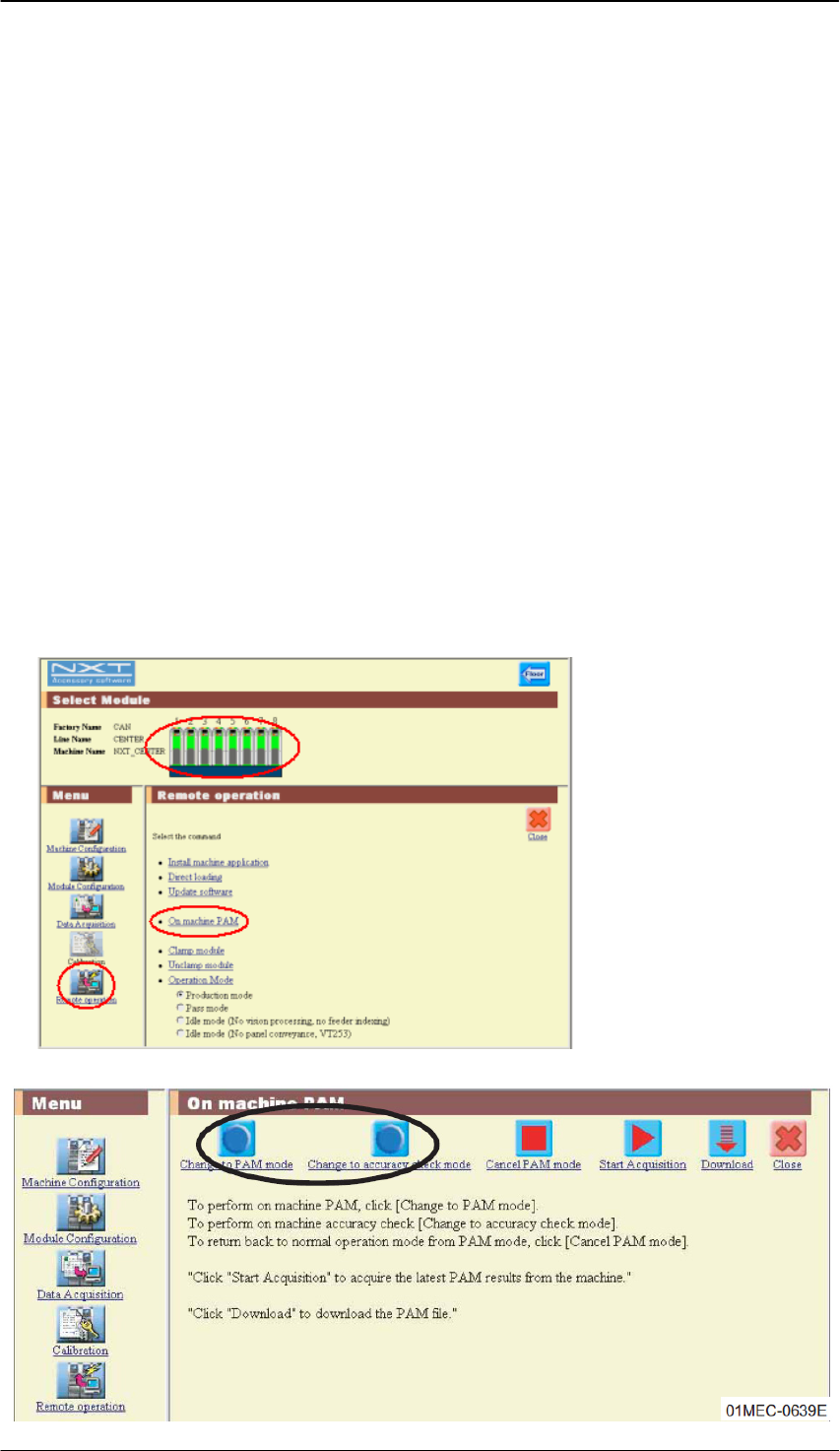 Edition 1.0 N X T I I 用户高级培训手册 FMC-1010-003-0 C 5-27 FUJI MACHINE MFG. CO., LTD 5.1.10 PAM 测试的设定 在机上 PAM 时,有以下 2 个模式,请选择符合目的的模式。 a. 测定贴装精度后进行初始修正值算出、反映的「 PAM 模式 」。 b. 仅仅进行贴装精度的确认的「贴装精度确认模式」( V5.11 开始对应)。 备注 ) 关于在此说明的附加软件…