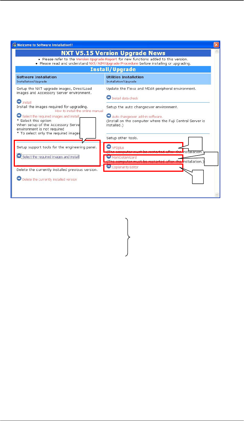 Edition 1.0 N X T I I 用户高级培训手册 FMC-1010-003-0 C 2-9 FUJI MACHINE MFG. CO., LTD (IV) 编程用 PC 上的 安装 (Installing in the programming PC) 1. 将 NXT(II) application software CD No.1 放在编程用 PC 的光驱里,然后就会显示以下安 装菜单画面。 2. 点击 “ C ” ,选择…