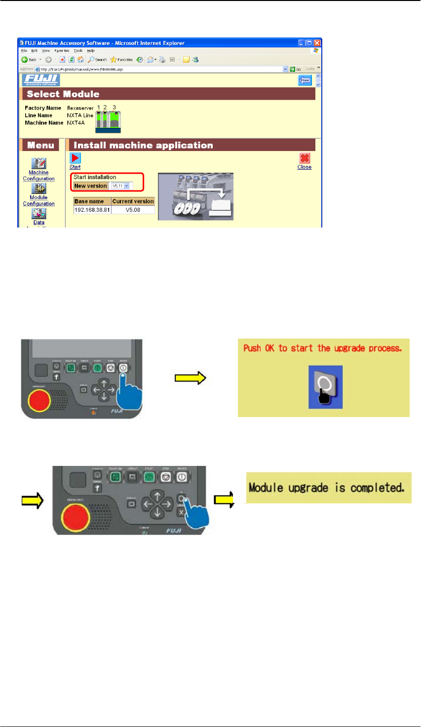 Edition 1.0 N X T I I 用户高级培训手册 FMC-1010-003-0 C 2-12 FUJI MACHINE MFG. CO., LTD 4. 选择将要升级的版本后点击 [Start] 。 5. 安装完成后会显示 [OK] 画面。 6. 重新启动机器。 2.2.3 模组的版本升级 (Upgrading the module version) 1. 按下模组上操作面板的 POWER 按钮唤醒模组, 就会出显示以下画面…