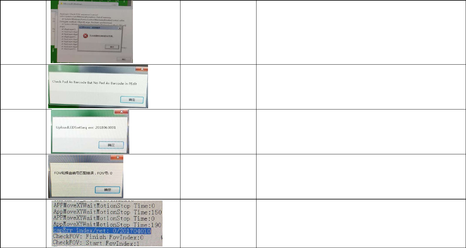 129 打开UI软件报此信 息 PLC通讯没连上,网线端口被换了,换回来后OK 192.123.123.3 130 打开UI软件报此信 息 更换100PIN线后OK; 131 Mark点teach后还 报错 1,确认极限位没问题;2,发现矫正数据被修改掉, 1轨的玻璃板数据被2轨覆盖掉了;导致Y轴跑不过 去,logrecord里面显示-1,超极限; 132 打开UI软件报此信 息 (新采集卡)runtime5.4.2压缩文件拷贝解压出来…