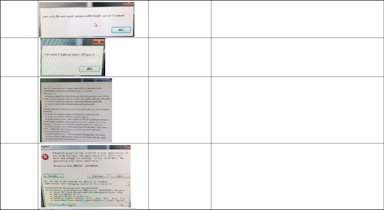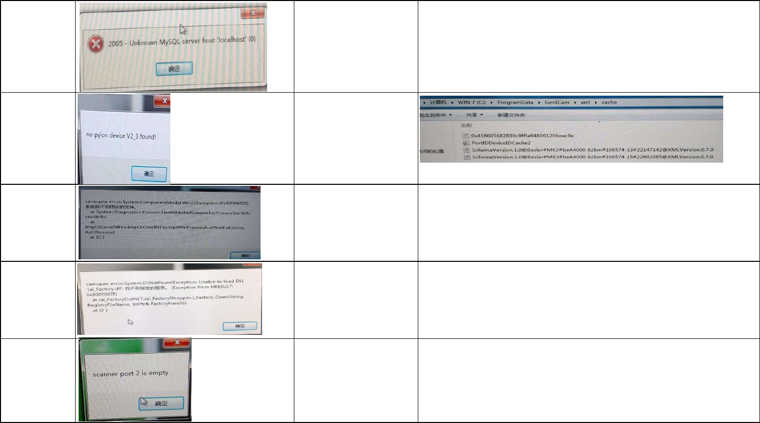 168 打开UI软件报此信 息 config不对,把CamMap_0,scale,RGB等文件删除后 OK, 需要重新校正机器(2D&3D); 169 打开UI软件报此信 息 夹板出错,调整夹板气缸后OK; 170 SPC V1报错 删除EYSPI/SPCData/2018/1/1003.sv1-journal临时 文件后OK; 171 打开UI软件报此信 息 更换USB相机后OK;