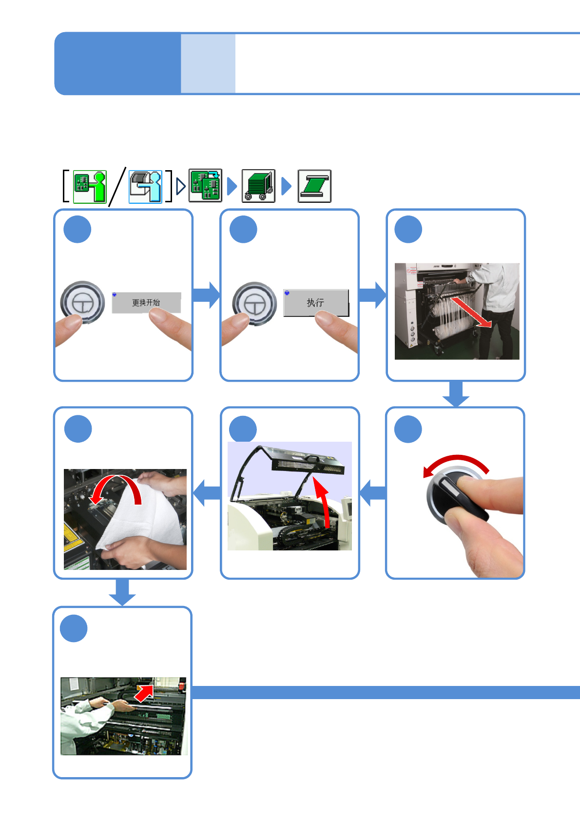 NPM-W 2 EJM7DC-MB-02O-0 2 OFF SERVO 个别 准备 2-5-3 -1 1 ENABLING 基板支撑销的安装 1 操作篇 2-5-3 卸下基板 2 3 ENABLING 卸下更换台车 ( → 『维修保养篇』 P.3-2) 5 4 7 6 把棉纱布盖到线 性照相机上 把料架工作台盖往 内推 确认提示 在执行安装 / 拆卸基板支撑块的作业时,只有在 双传送带规格且后侧交换台车规格 设备的双轨模式下,从对象 基…