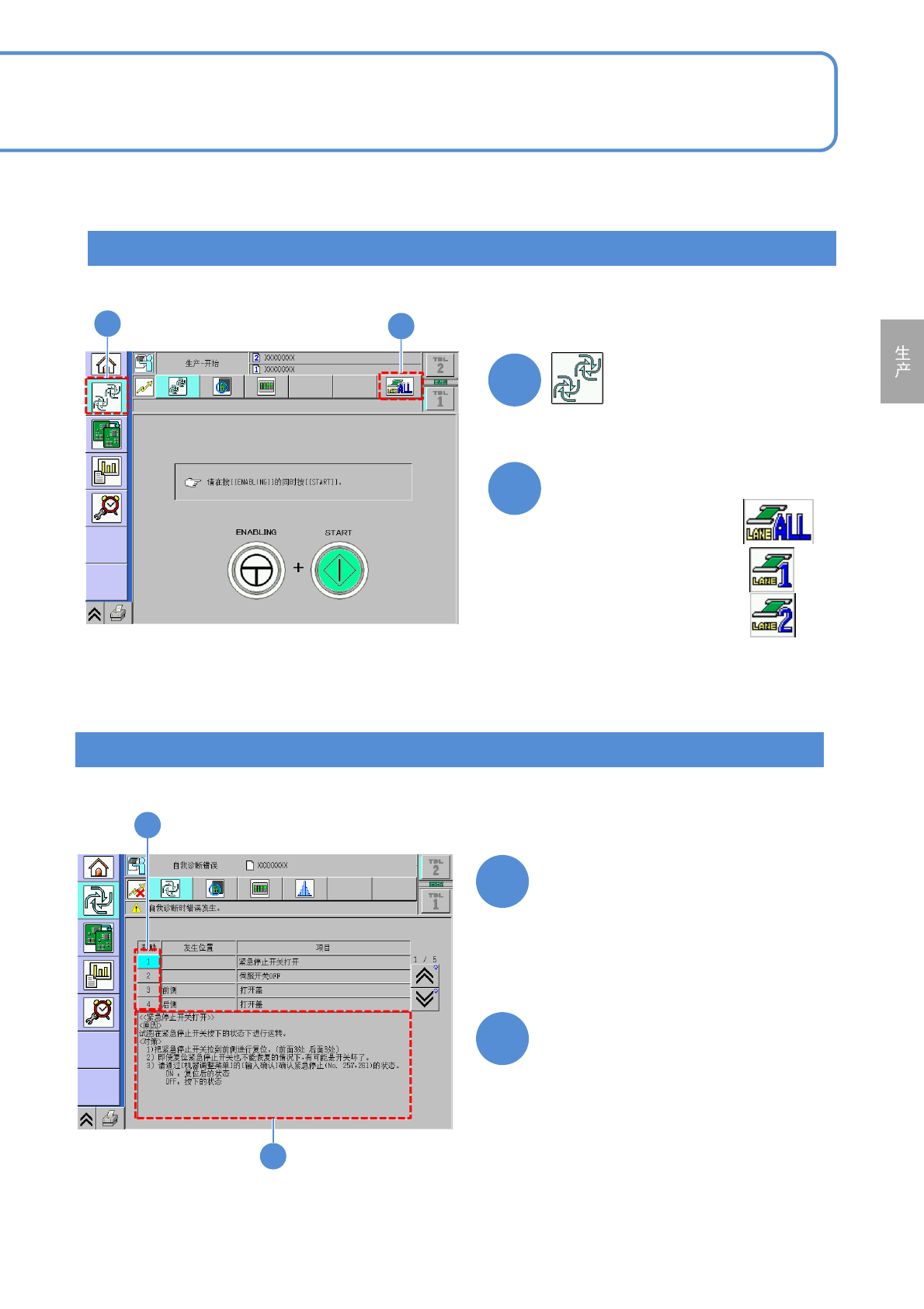 NPM-W 2 EJM7DC-MB-03O-02 3-1-1 -2 自我诊断后有异常时 1 2 1 选择项目 ( 显示修改方法 ) 2 按照指示进行修改 独立实装模式时 1 ( 显示独立实装模式 ) 2 选择轨道 在前后轨道上开始生产时: 只在轨道 1 开始生 产时: 只在轨道 2 开始生 产时: 1 2