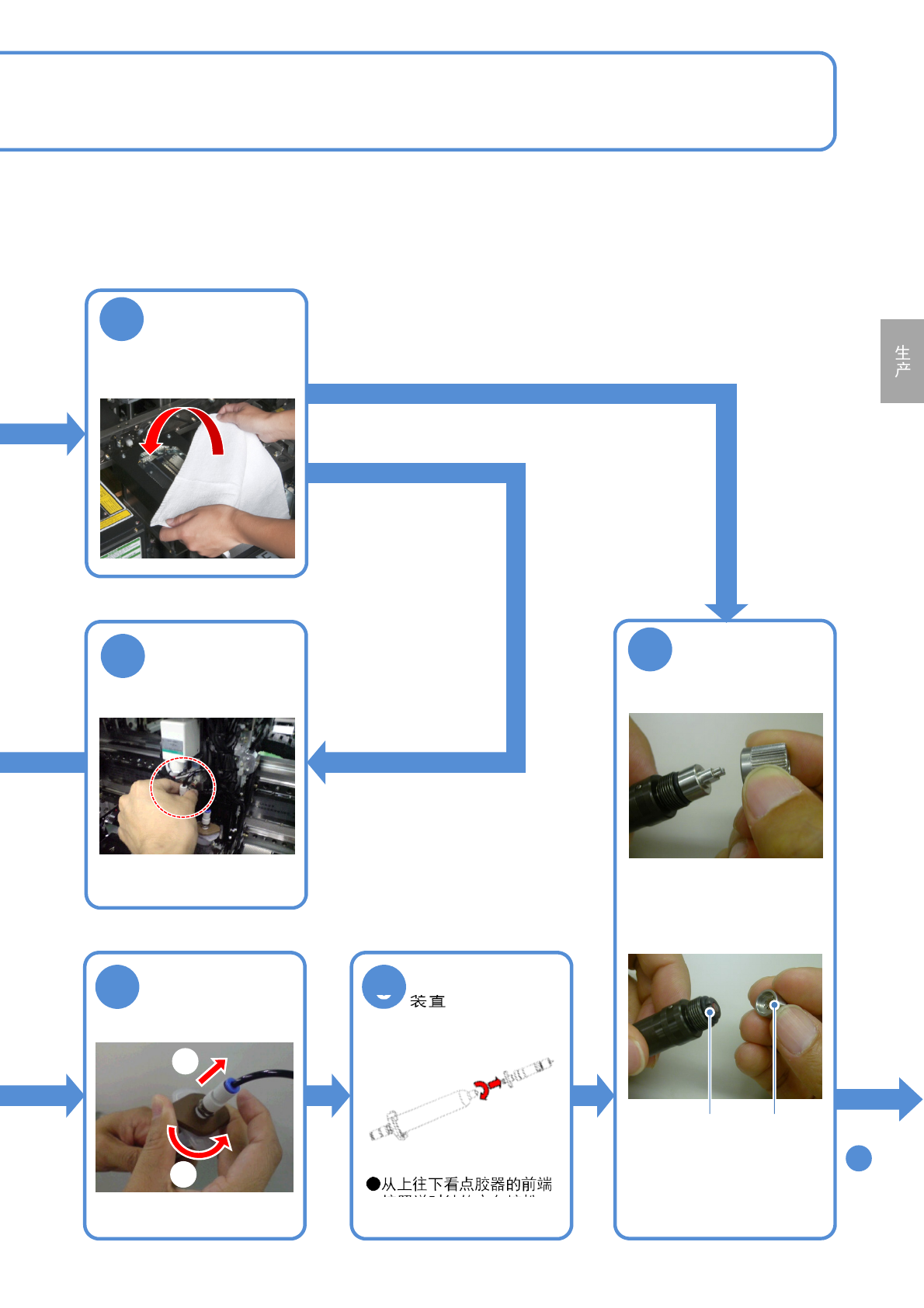 NPM-W 2 EJM7DC-MB-03O-0 2 3-4 -1 OFF SERVO 以点胶头安装在后侧,从前侧来操作 的情况进行说明。 1 ENABLING 2 3 把点胶头移动到更 换位置 6 卸下点胶器 将注射器向正上方拔出。 1 2 1 2 ●在更换注射器时,如果向顺时针方向旋转 SC 轴齿 轮,将会导致粘着剂的吐出。 锁板 Θ 轴 ●交换点胶器时 , 请注意不要向 X 轴的线性标 尺保护盖 施加外力。 否则,保护盖会变形,使线…