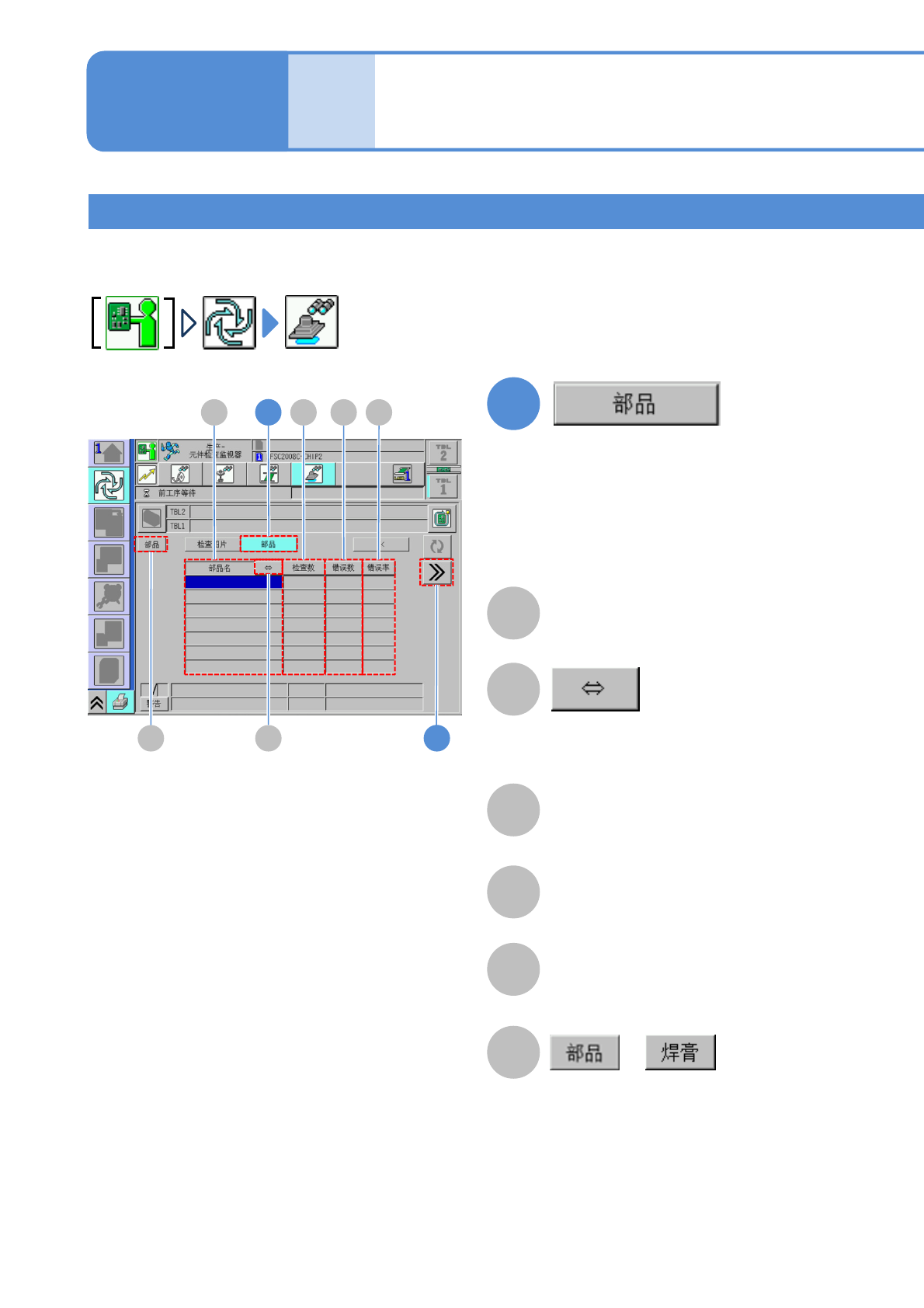 NPM-W 2 EJM7DC-MB-05O-0 0 J 同一元件之后的锡膏的不良判定信息 。 I 显示同一元件之前的锡膏的不良判定 信息。 K L M 5-4-3 -4 G H 显示前一个元件的锡膏的不良判定信 息。 显示下一个元件的锡膏的不良判定信 息。 切换轨道。基板被传出后 ●选择的轨道的检查结果为 OK ,对面的 轨道的检查结果为 NG 时,优先考虑 NG 的信息切换为对面的轨道。 ●两轨道的检查结果都为 OK 时或者都为 NG…