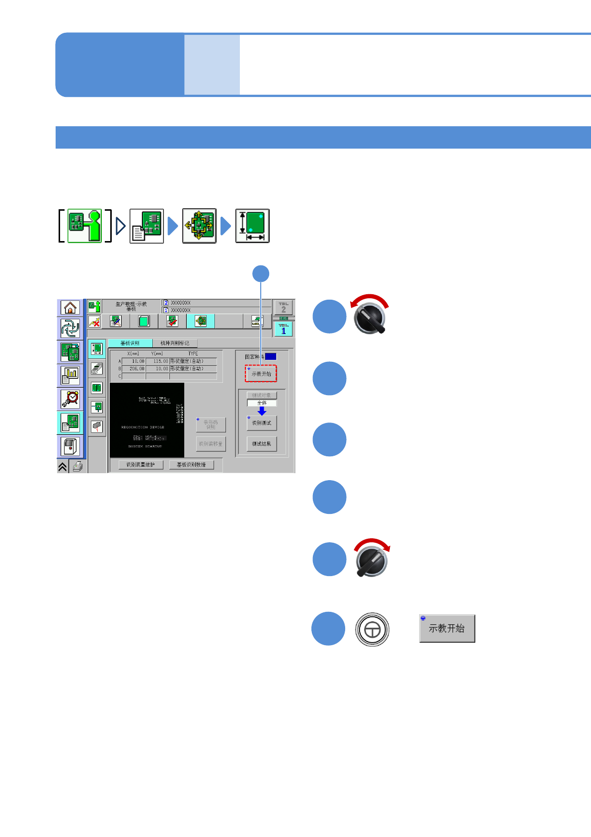 NPM-W 2 EJM7DC-MB-06O-00 生产数据 校正 ●在进行基板识别的校正前,请在 NPM-DGS 侧确认所编制数据的软件开关 ‘ 基板识别 ’ ( → P.6-1-20) 是否 设定为 ON 。 ●当传送带宽度不符合标准时,请进行调整 。 ( → P.2-5-4) 校正 1 基板识别校正 2 打开安全盖 1 2 把基板放置基板传入口 3 4 关闭安全盖 5 操作篇 6-2-2 6 + ( 基板被传入,在传出位置被夹住。贴…