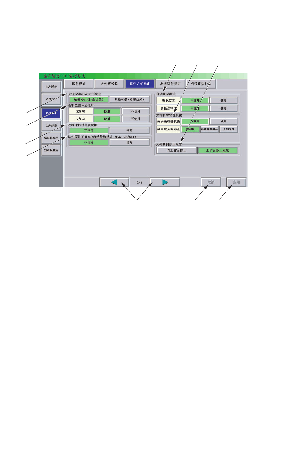 2-21 0708-001 4.2 送料器替代 [3] 设定 在 “ 送料器 ” 栏中,显示 [2] 中选择的送料器编号。 [ 有效 ]、[ 无效 ] 按钮 选择变更送料器替代 “ 有效 ” / “ 无效 ” 的送料器,根据按 [ 有效 ] 按钮或 [ 无效 ] 按钮可进行手动切换。 [4] [ 送料器全体有效 ] 按钮 在 [2] 中选择的送料器安装台内 ( 界面中是送料器安装台 1) 的送 料器全部变为 “ 有效 ” 。 [5] […
