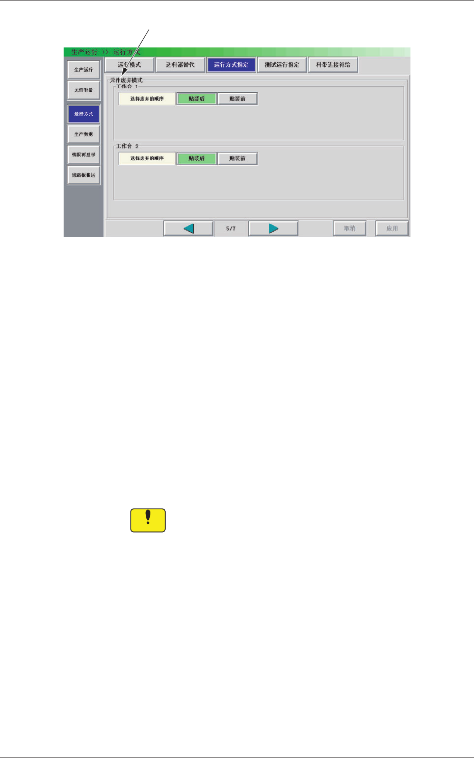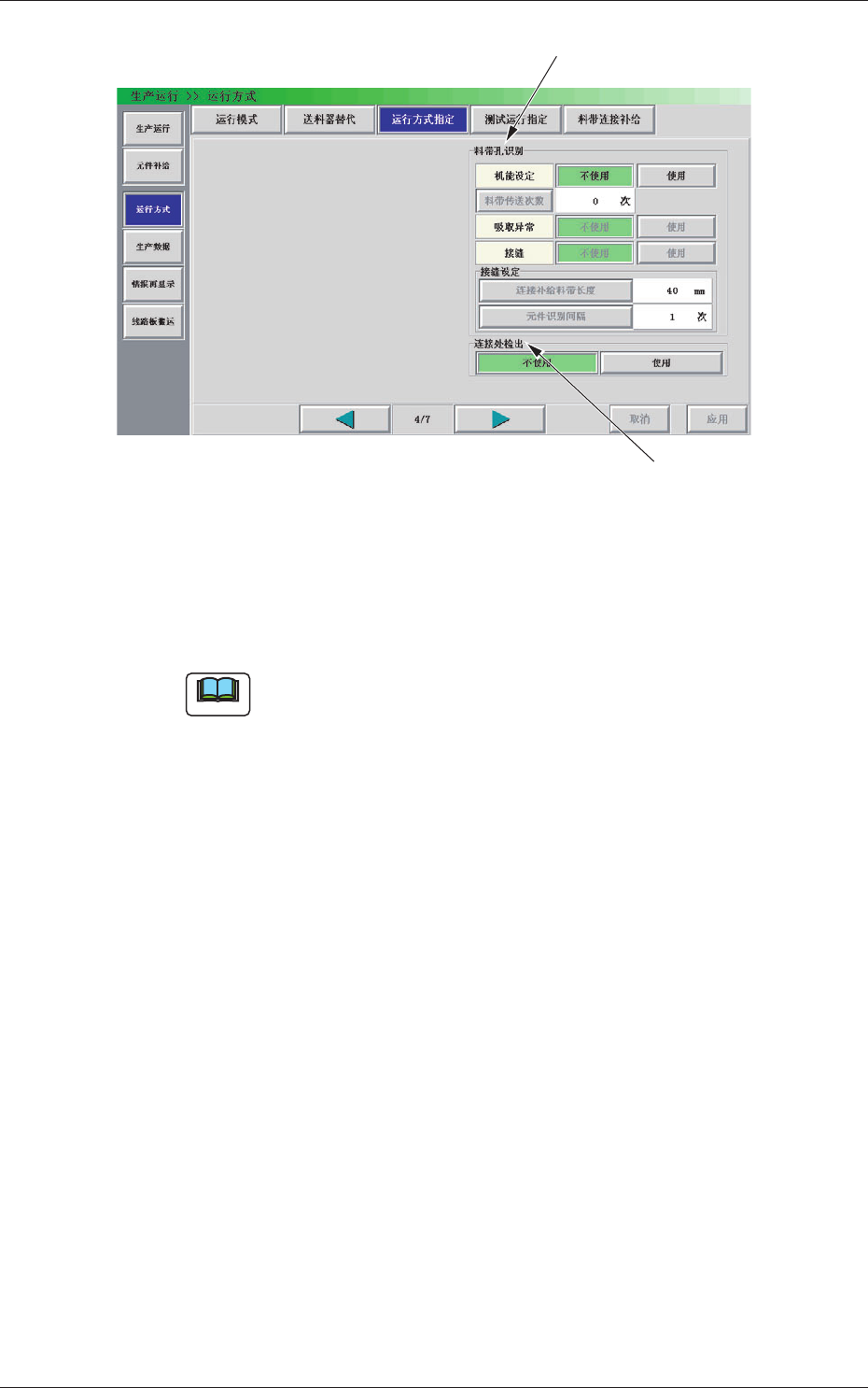 2-31 0708-001 4.3 运行方式指定 “ 吸取异常 ” 设定在吸取异常时是否进行料带孔识别自动教示。 [ 不使用 ] 按钮 吸取异常时不进行料带孔识别的自动教示时选择。 [ 使用 ] 按钮 吸取异常时进行料带孔识别的自动教示时选择。 “ 接缝 ( 连接处 ) ” 设定在连接处检出时是否进行料带孔识别的自动教示。 [ 不使用 ] 按钮 连接处检出时不进行料带孔识别的自动教示时选择。 [ 使用 ] 按钮 连接处检出时进行料带孔识…