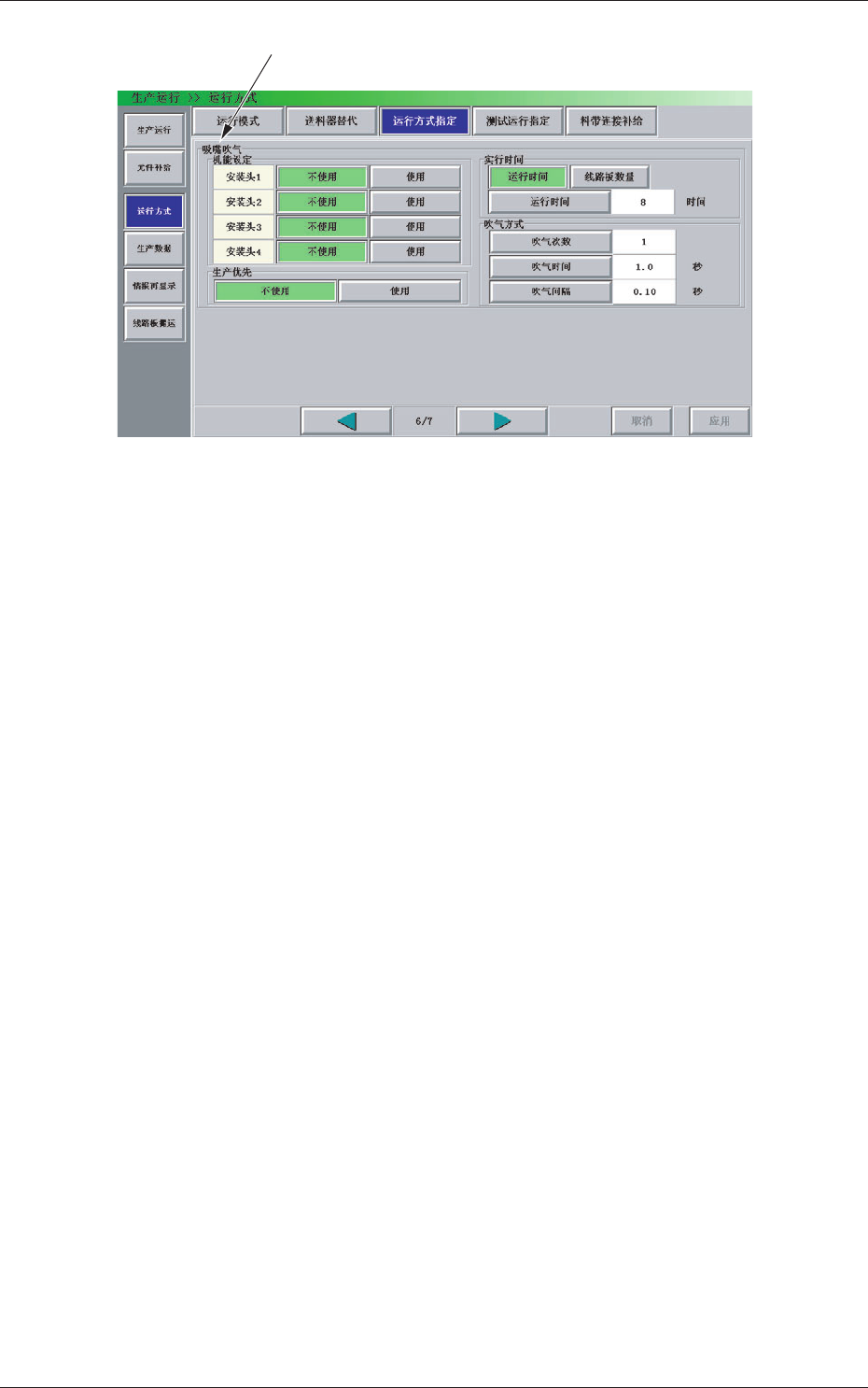 2-33 0801-002 4.3 运行方式指定 [16] Fig.2B14-6 “ 运行方式指定 ” 界面 ( 第六页 ) [16] 吸嘴吹气 吸嘴吹气是指将吸嘴真空阀按各个吸嘴切换,进行吸嘴内径的吹 气,预防吸嘴堵塞的功能。 使用该功能,可以延长吸嘴的维护保养周期。 机能设定 安装头 1、安装头 2、安装头 3、安装头 4 [ 不使用 ] 按钮 不使用吸嘴吹气机能。 [ 使用 ] 按钮 使用吸嘴吹气机能。 生产优先 [ 不使用 ] …