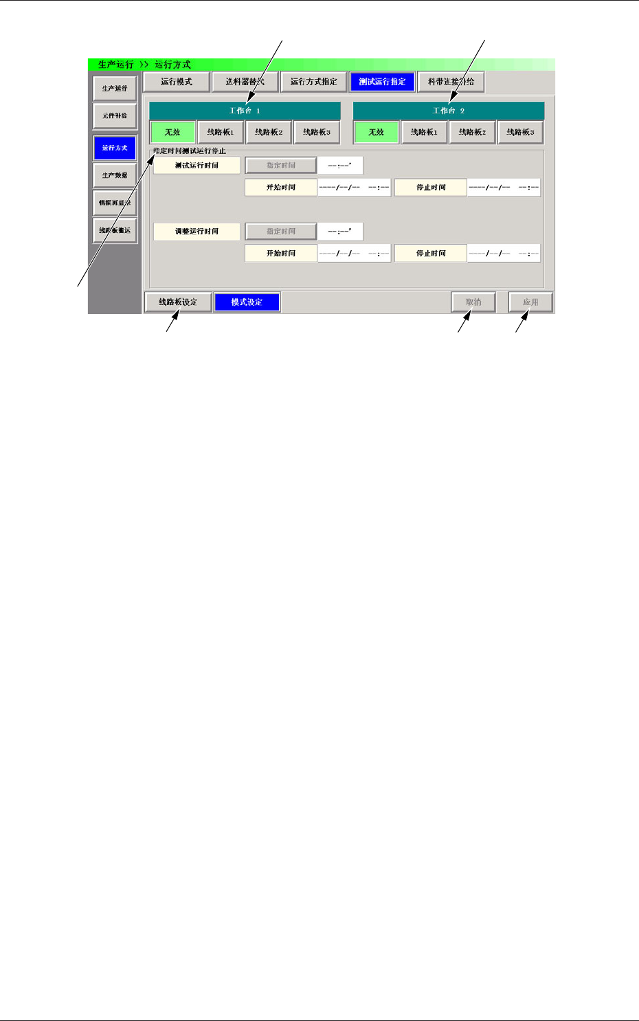 设定工作台 1 及工作台 2 的测试运行模式。