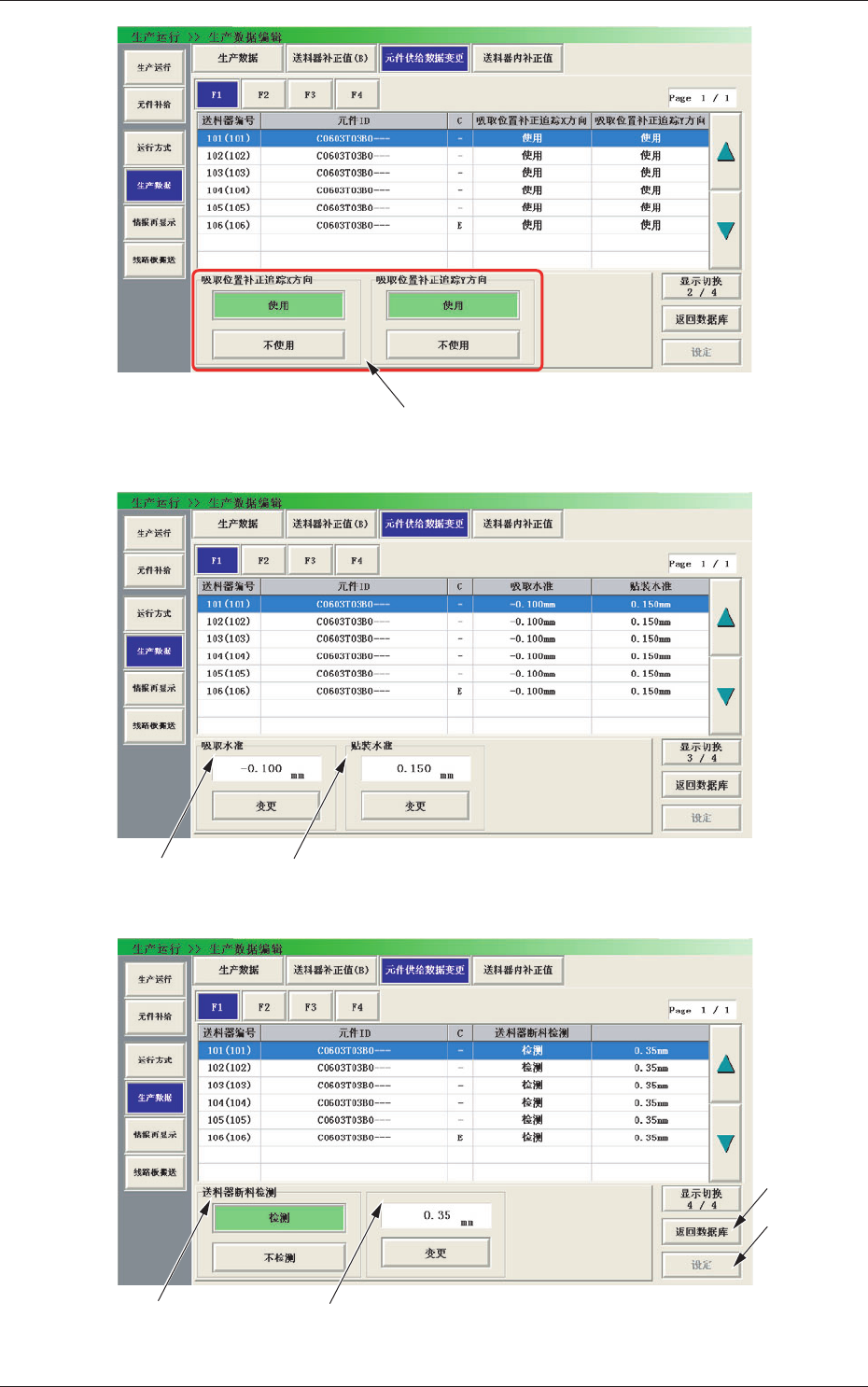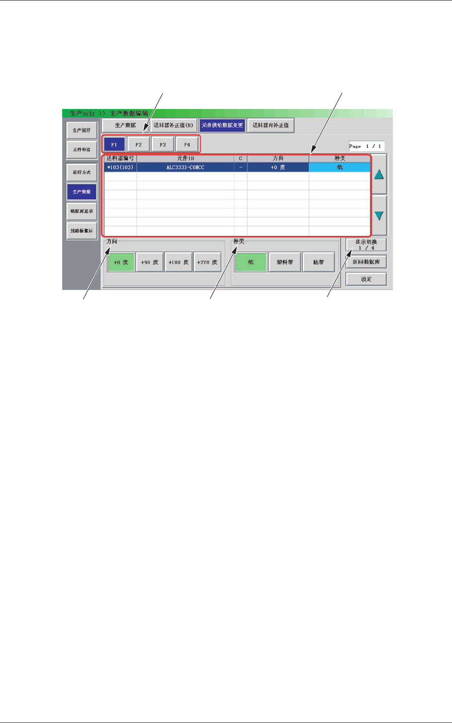 2-47 0708-001 5.3 元件供给数据变更 5.3 元件供给数据变更 按 [ 元件供给数据变更 ] 按钮,便显示 “ 元件供给数据变更 ” 界面 ( 第 一页 )。 Fig.2B31-1 “ 元件供给数据变更 ” 界面 ( 第一页 ) [1] 送料器安装台选择按钮 [F1]、[F2]、[F3]、[F4] 配置在对应于各按钮编号 (n) 的送料器安装台中的元件供给数据, 显示在 [2] 中。 [2] 元件供给数据一览 显示在 […