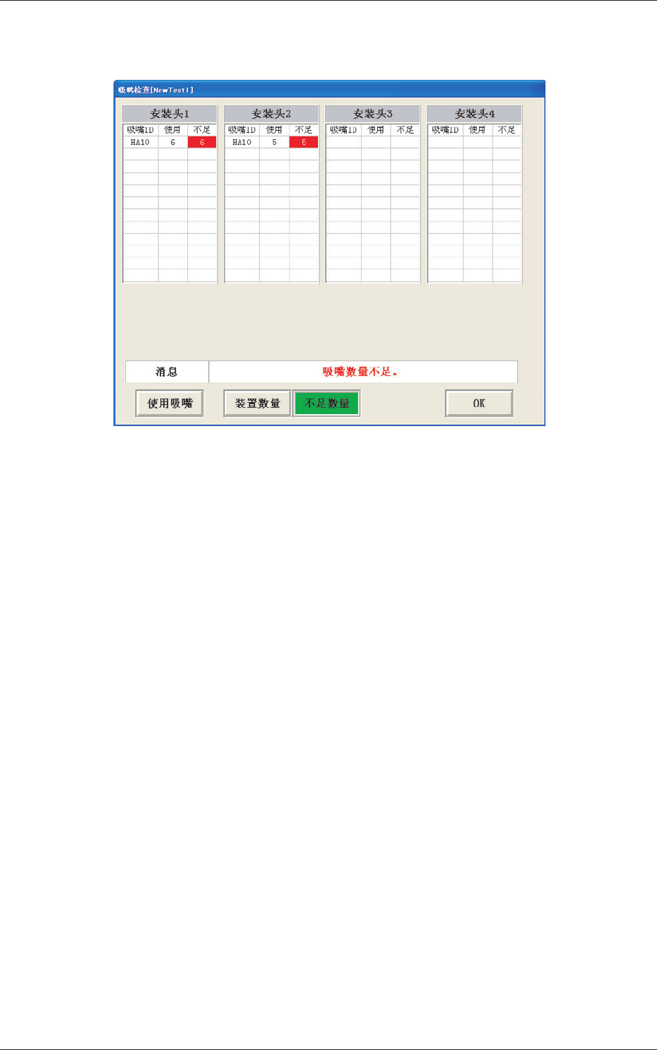 有不足的吸嘴时,对应于不足吸嘴 ID 的不足数量显示为红色,显