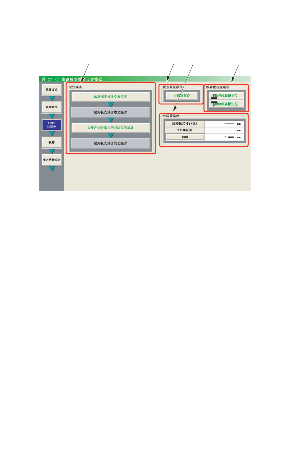 3-8 5 . “ 线 路 板支 撑 针 设 定模 式 ” 界 面 在 “ 设定 ” 子菜单栏中,按 [ 支撑针 传送带 ] 按钮,便显示 “ 线路板 支撑针设定模式 ” 界面。 Fig.2C6 “ 线路板支撑针设定模式 ” 界面 0708-001 5. “ 线路板支撑针设定模式 ” 界面 [1] [3] [4] [2]
