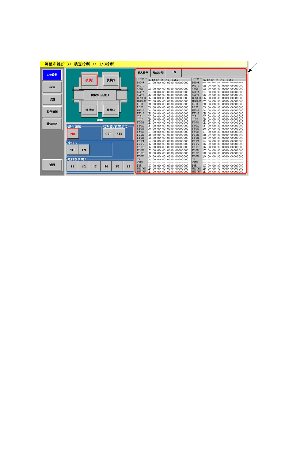 4-12 0801-002 3.1 “ I/O 诊断 ” 界面 3.1.3 一览 一览显示 Stage #1 及 Stage #2 各传感器的输入输出状态。 在 “ I/O 诊断 ” 界面中,按 [ 一览 ]Tab,便显示 “ 一览 ” 选项卡。 [1] Fig.2D7 “ 一览 ” 选项卡 [1] 状态显示 显示每个 Stage 各部分的状态。
