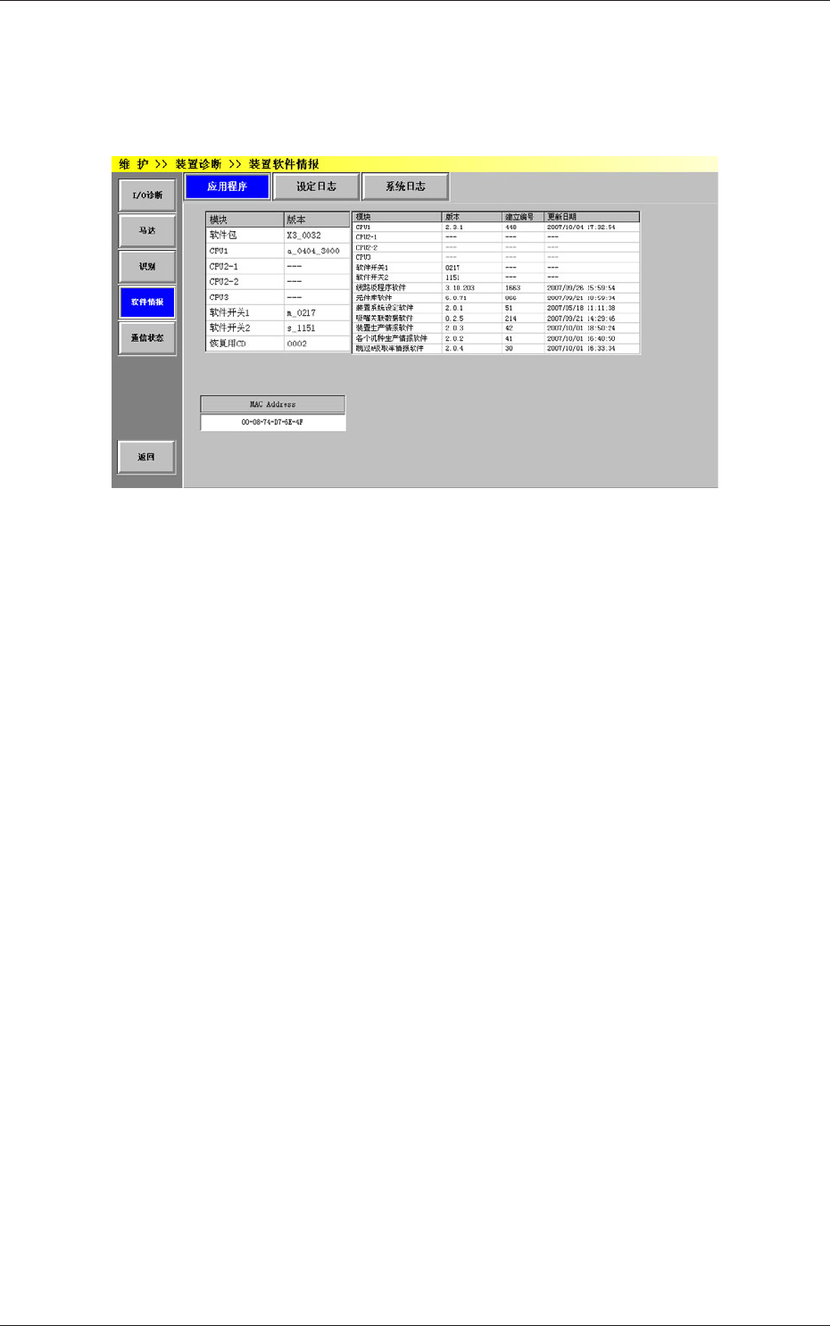 显示每个模块的应用程序版本、应用程序更新时间、MAC Address。