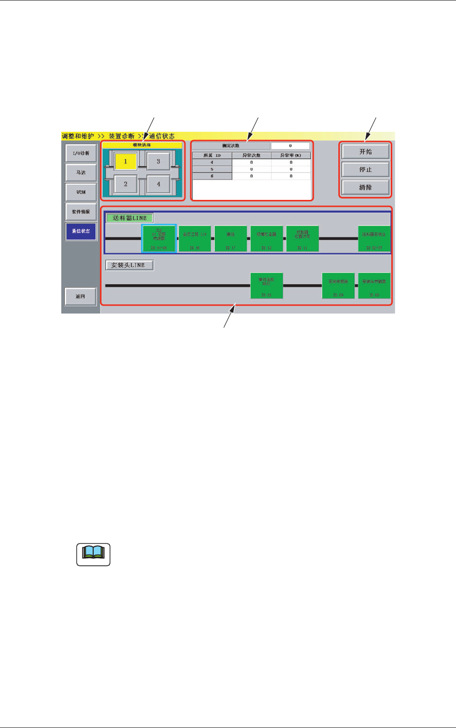 4 - 26 - 2 0801 - 001 3.5 “ 通信状态 ” 界面 [3] 异常概率显示部 显示 [2] 中选择的所属按钮的状态。 [4] [ 开始 ]、[ 停止 ]、[ 清除 ] 按钮 [ 开始 ] 按钮 按该按钮,便以 10msec 为周期进行异常检查。 [ 停止 ] 按钮 按该按钮,停止检查。 [ 清除 ] 按钮 按该按钮,清除测定次数和异常次数 。