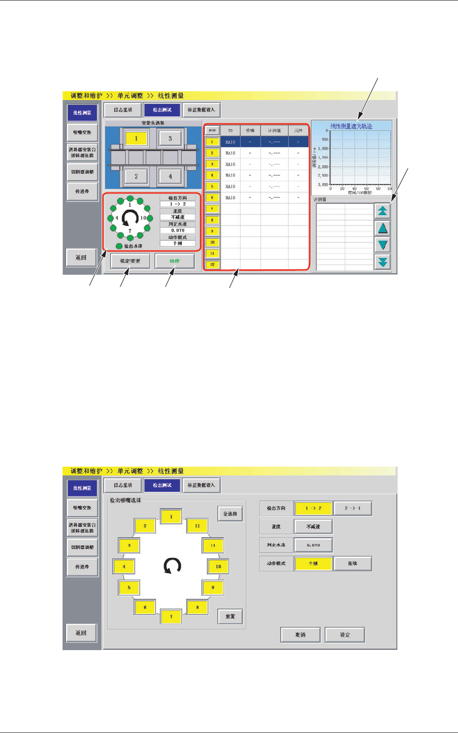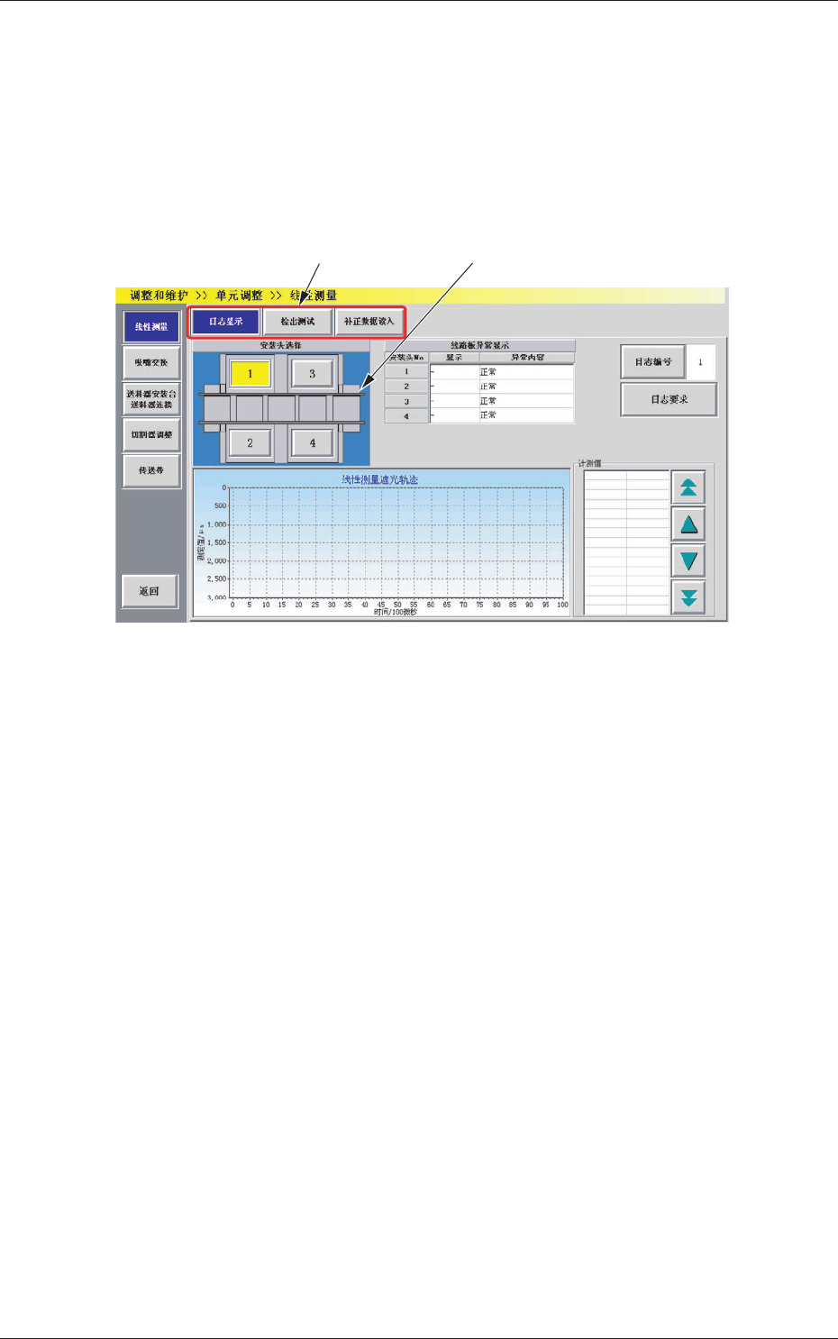 用图表及数值显示装备在各贴装安装头上的线传感器遮光轨迹。
