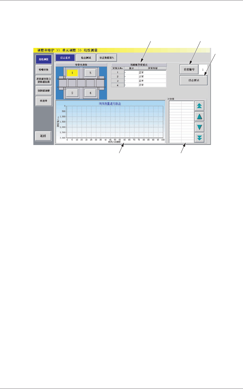 4-29 0708-001 4.1 “ 线性测量 ( 线传感器 ) ” 界面 4.1.1 日志显示 按 [ 日志显示 ] 按钮,便显示 “ 日志显示 ” 界面。 Fig.2D18-1 “ 日志显示 ” 界面 [1] [ 日志编号 ] 按钮 按下该按钮, 便显示 “ 日志编号 ” 输入界面。指定进行计测显示的 日志编号。 在按钮的右侧,显示指定的日志编号。 [2] [ 日志要求 ] 按钮 显示指定日志编号的遮光轨迹数据。 [3] 计测值 …