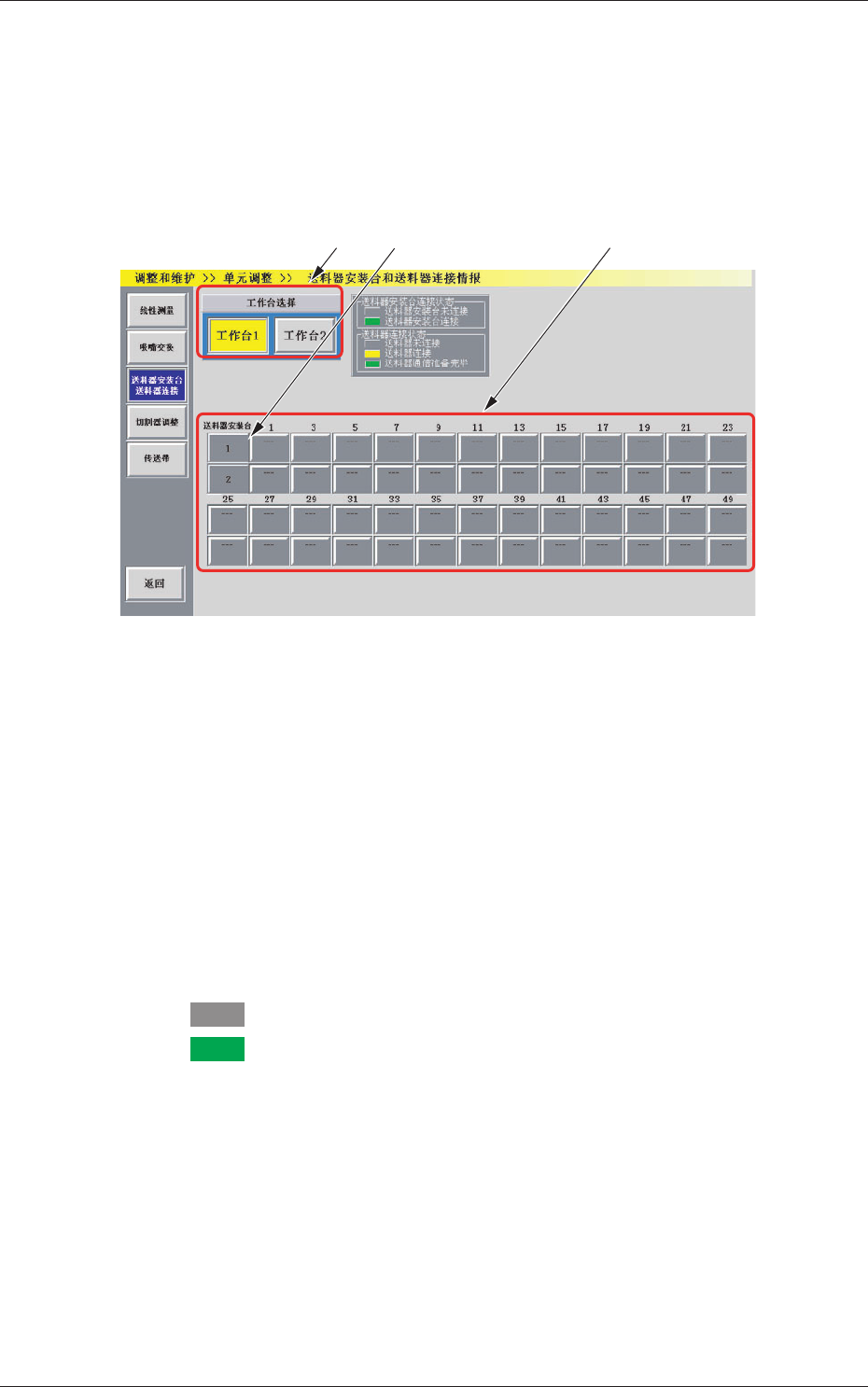 : 送料器安装台为连接状态时,显示为绿色。