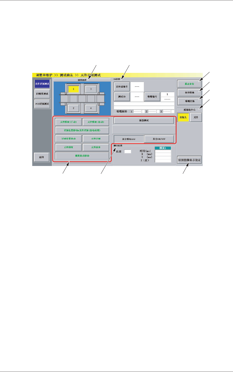 4-47 0801-002 5. “ 测试确认 ” 子菜单 在 “ 调整和维护 ” 菜单界面中,按 [ 测试确认 ] 按钮,便显示 “ 测试确 认 ” 子菜单栏和作为初始显示界面的 “ 元件识别测试 ” 界面。 [2] [1] Fig.2D22 “ 测试确认 ” 界面 [1] “ 测试确认 ” 子菜单栏 为显示执行测试确认各功能的操作界面,配置有以下按钮。 Table 2D8 功能选择按钮 内 容 元件识别测试 进行测试 ID 指定元件…