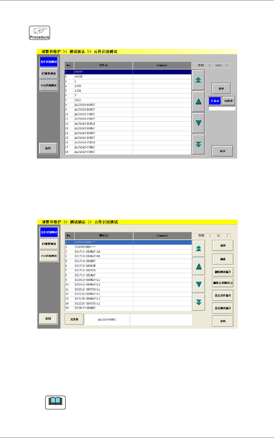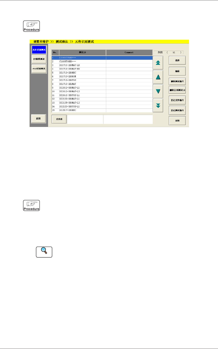 4-55 0708-001 5.1 元件识别测试 • 测试 ID 的删除 (1) 从 “ 测试 ID 选择 ” 界面的测试 ID 一览中选择要删除的测试 ID 后,按 [ 删除测试编号 ] 按钮。 显示删除测试编号确认界面。 (2) 按 [ 是 ] 按钮,选定测试 ID 便被删除。 Note 按 [ 删除全部测试 ID] 按钮,可以一次删除所有测试 ID。 • 登录测试 ID 到元件数据库 (1) 从 “ 测试 ID 选择 ” 界面的测…