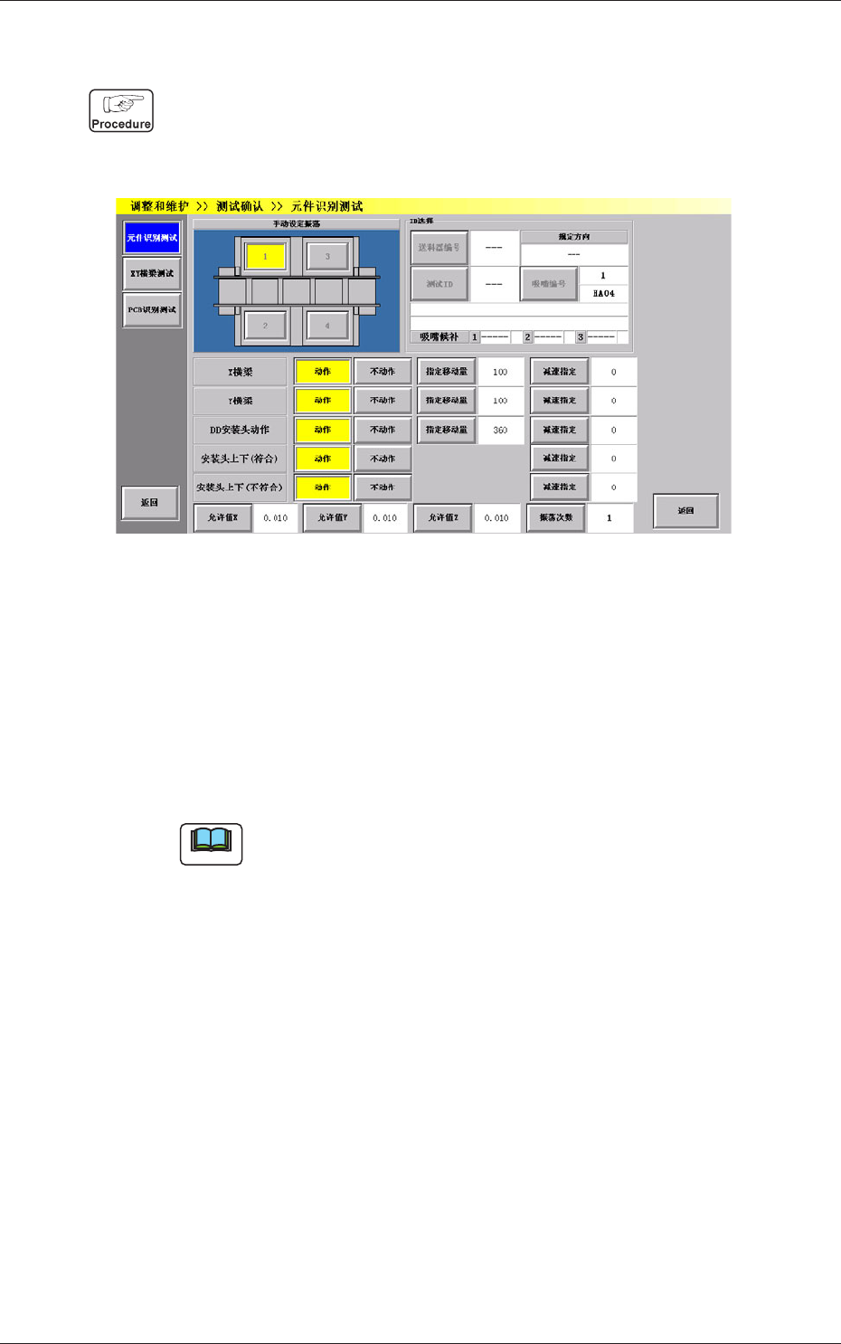 4-61 0708-001 5.1 元件识别测试 [2] 动作指定、移动量、减速指定 显示在 “ 手动设定振荡 ” 界面中设定的 X 横梁、Y 横梁、 DD 安装头 动作、安装头上下 ( 符合 )、安装头上下 ( 不符合 ) 的动作指定、 X 横梁、Y 横梁、DD 安装头动作的移动量、及 X 横梁、Y 横梁、DD 安装头动作、安装头上下 ( 符合 )、安装头上下 ( 不符合 ) 的减速 指定值。 Note 贴装有中异形元件用吸嘴的安装头…